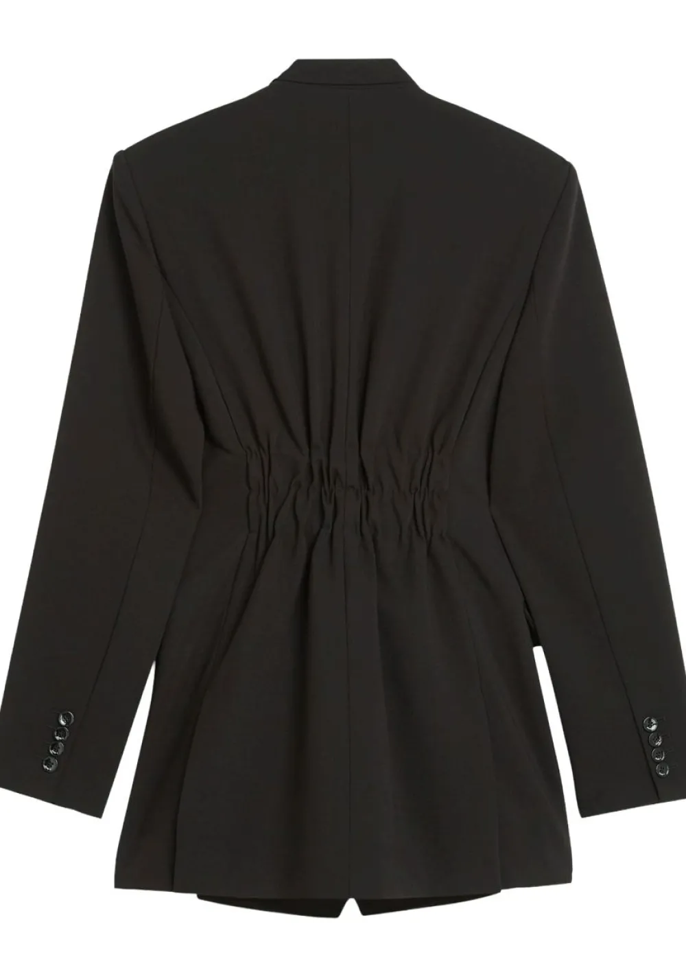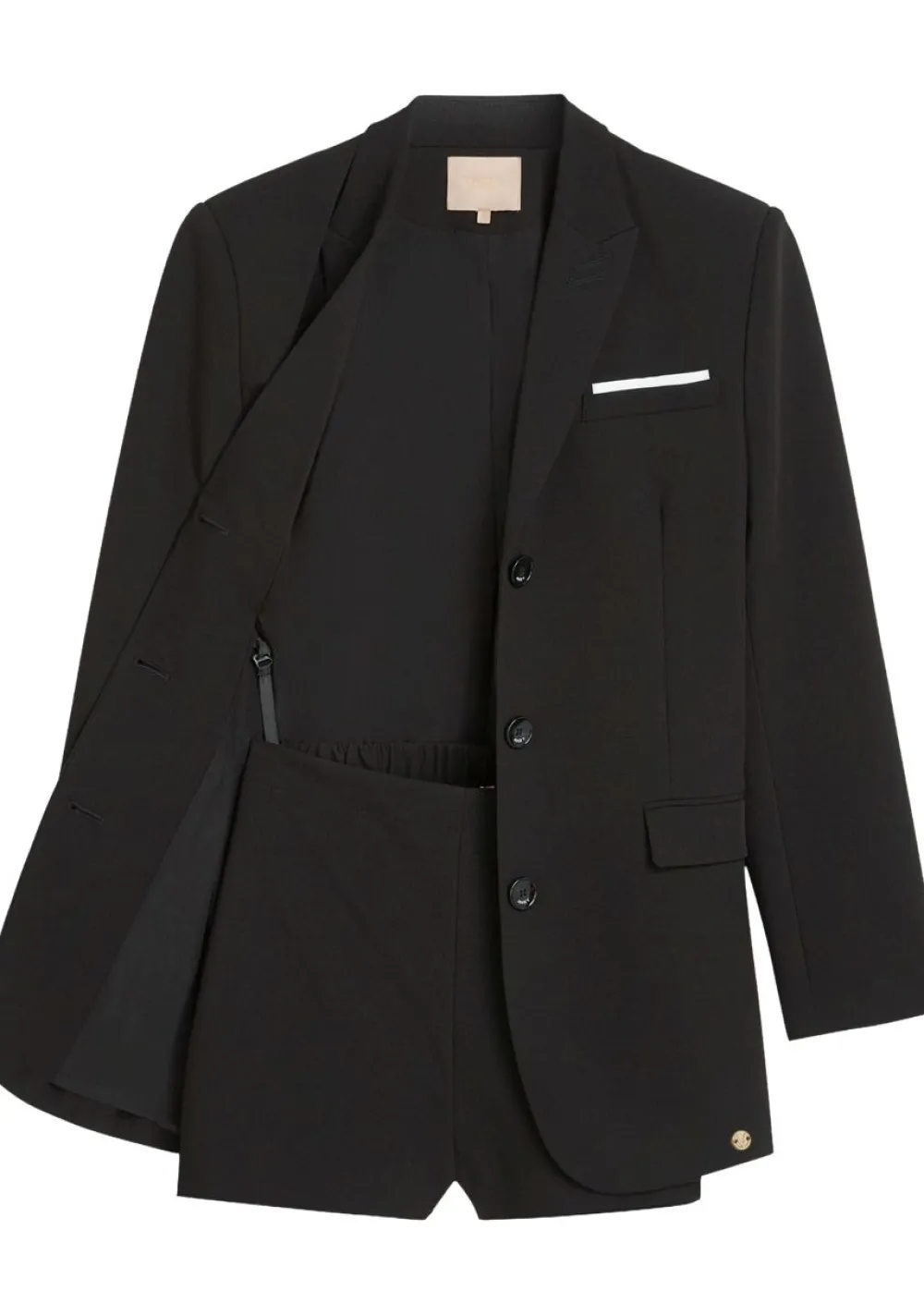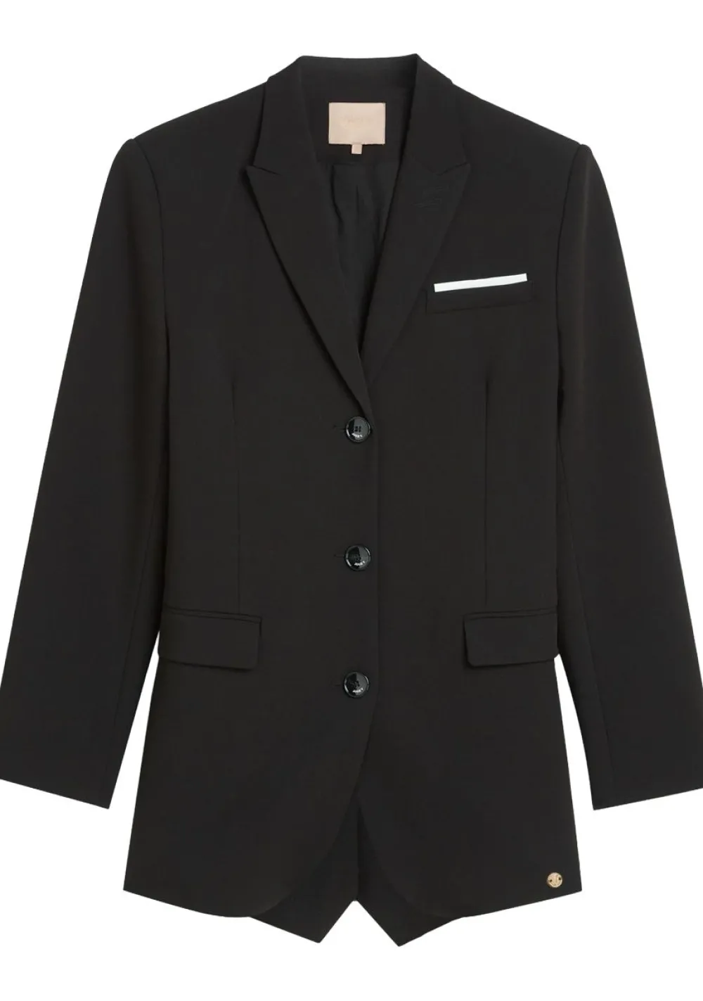 – De blazer is voorzien van klepzakken en schoudervulling. De achterzijde van de blazer is afgewerkt met elastisch detail, wat zorgt voor een getailleerde pasvorm