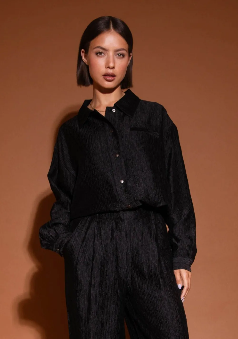 – Het model is 1.68m lang en draagt maat S