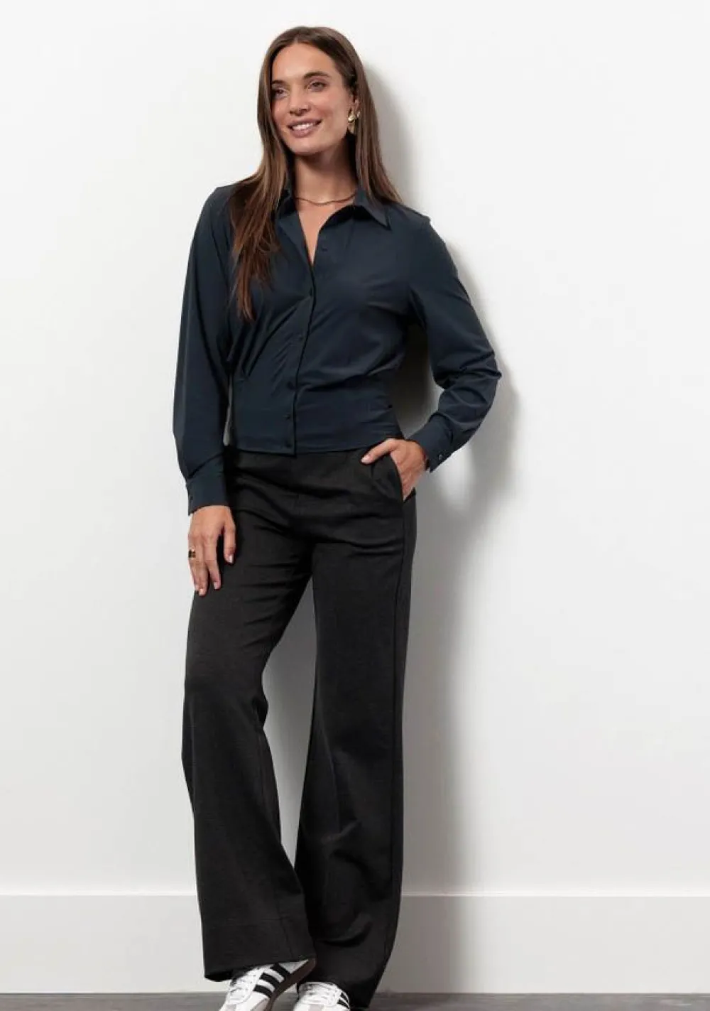 – Het model is 1.75m lang en draagt maat S