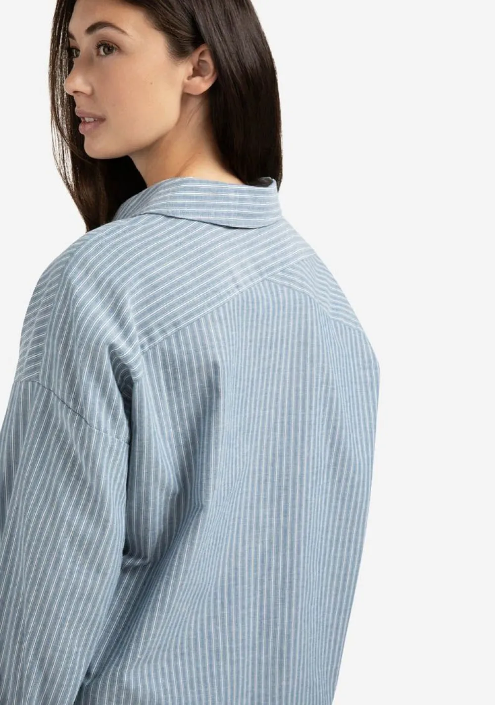 – Het model is 1.76m lang en draagt maat S