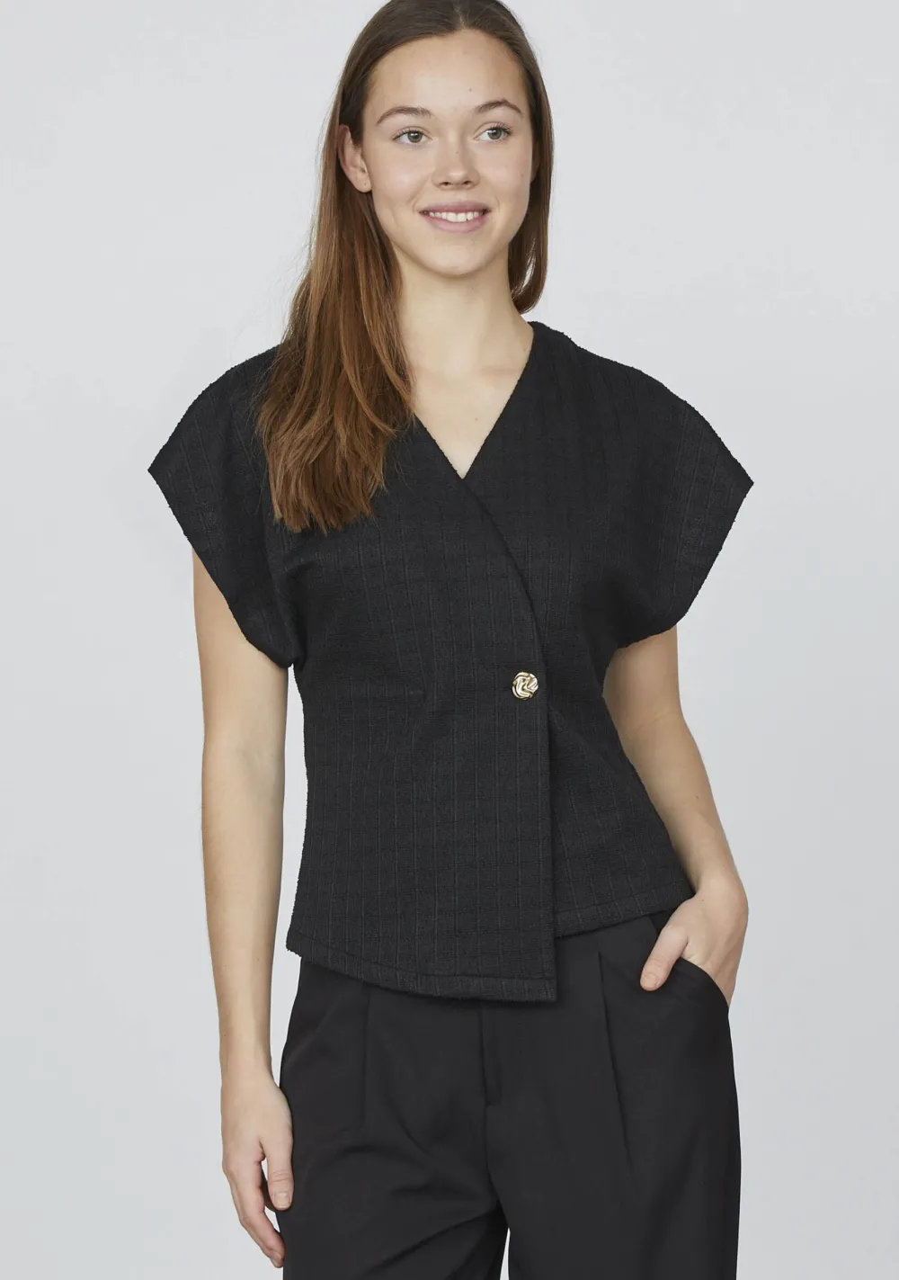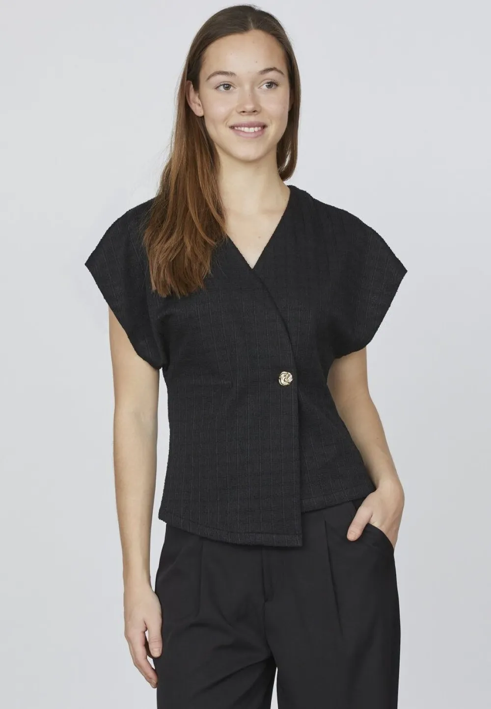 – Het model is 1.76m lang en draagt maat S