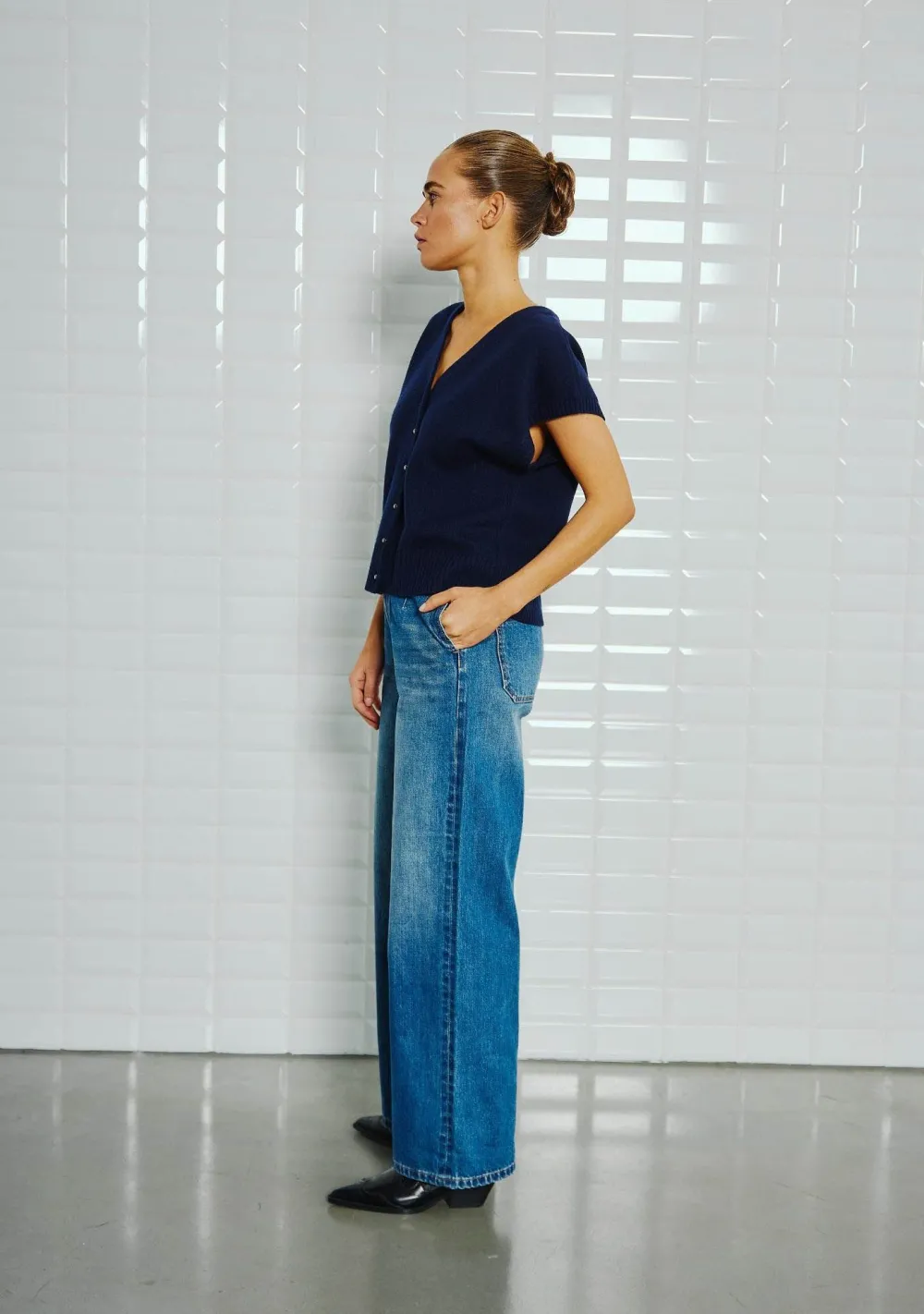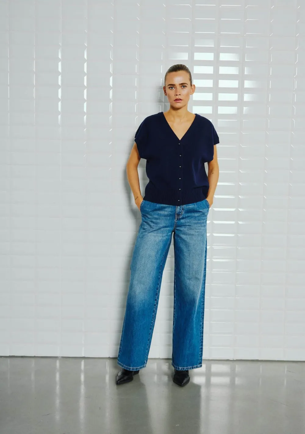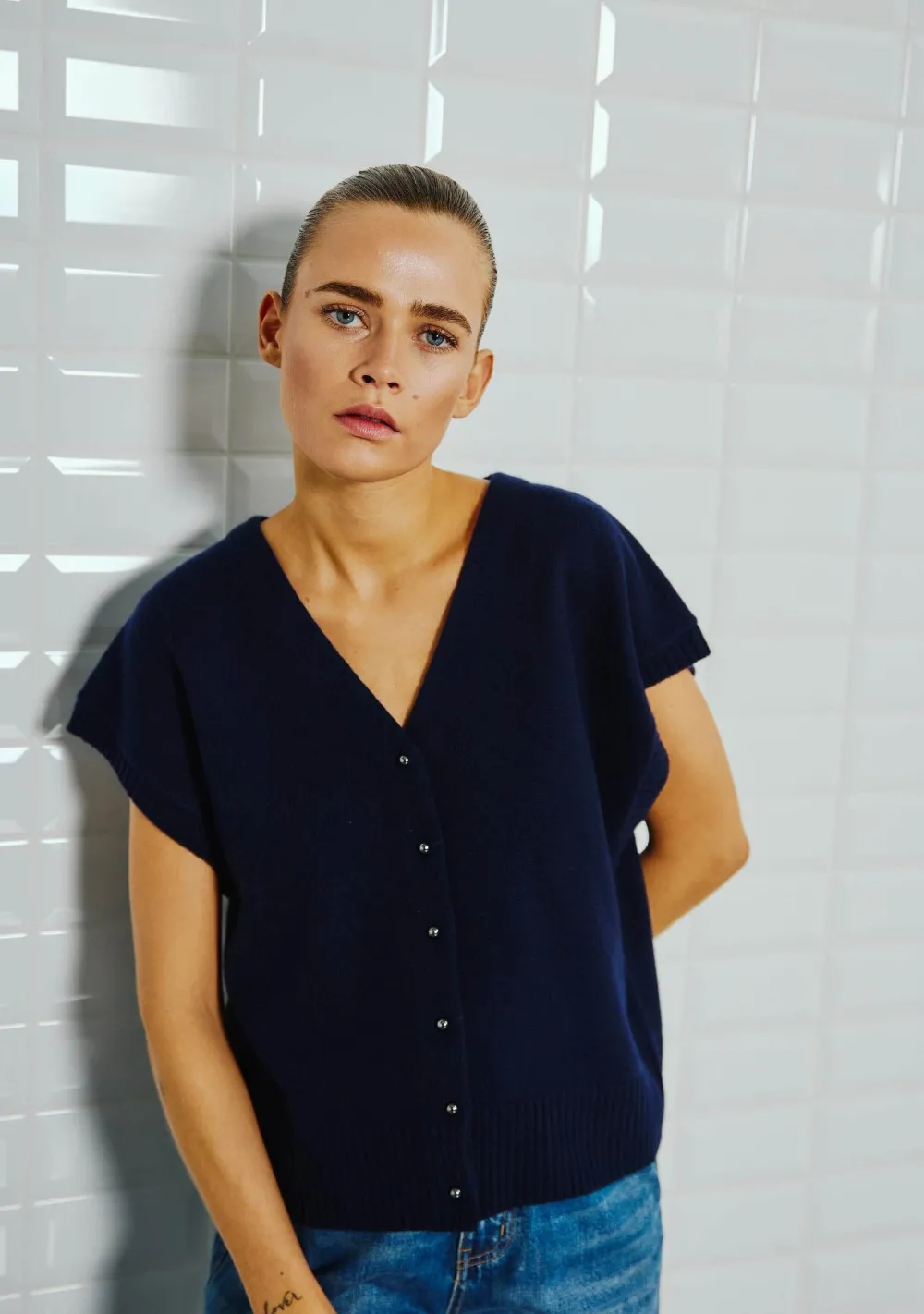 – Het model is 1.72m lang en draagt maat S