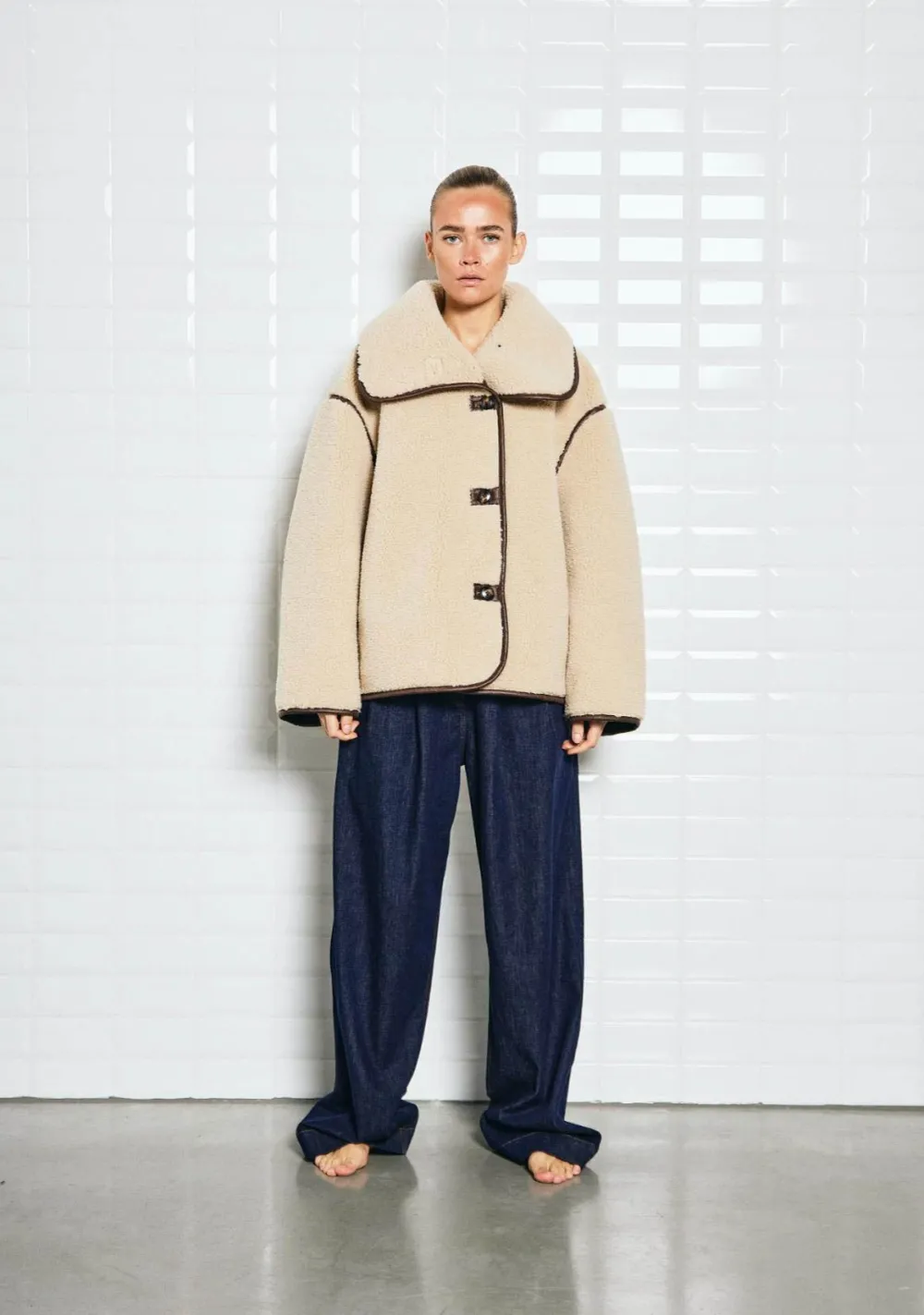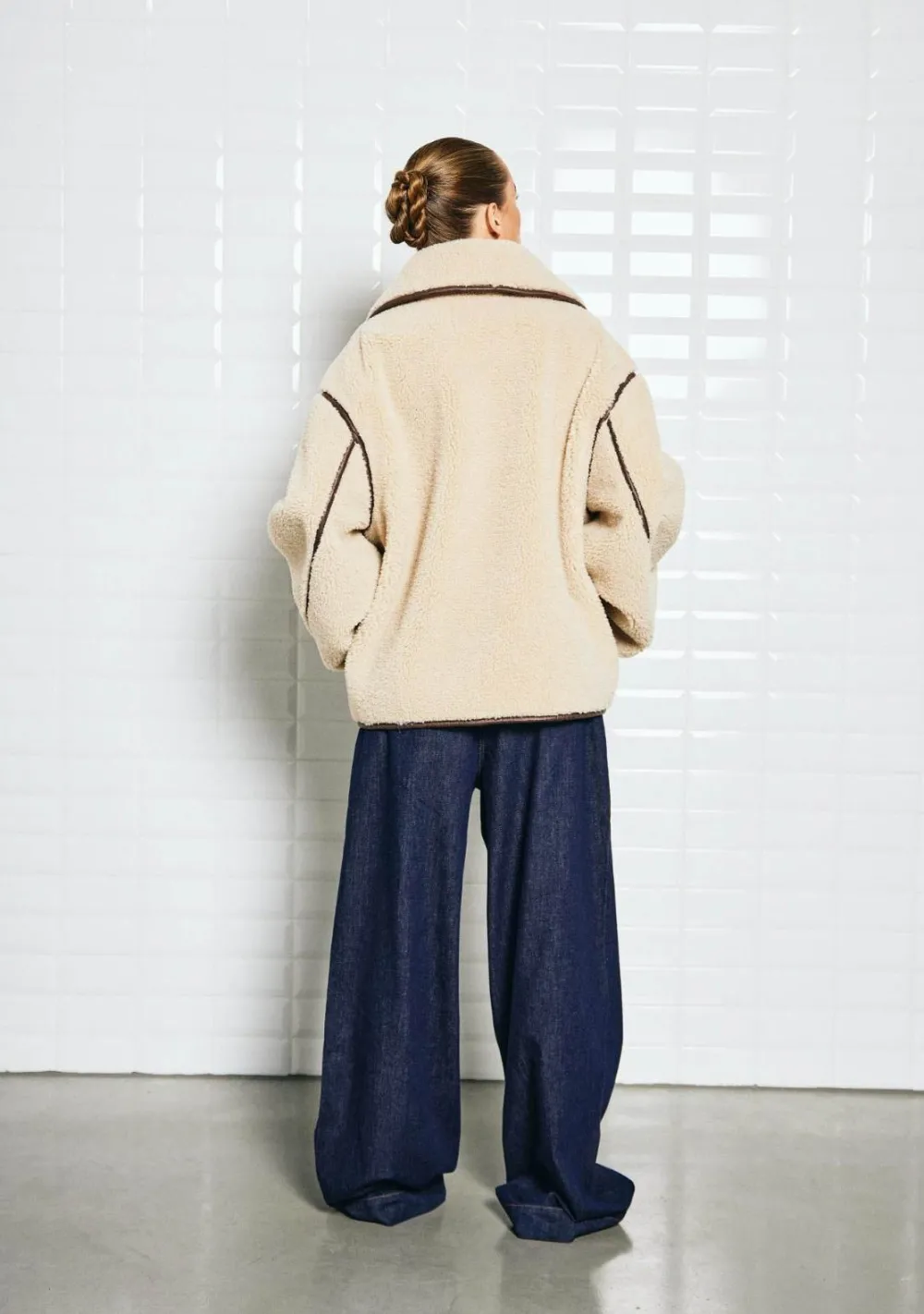 – Het model is 1.72m lang en draagt maat S