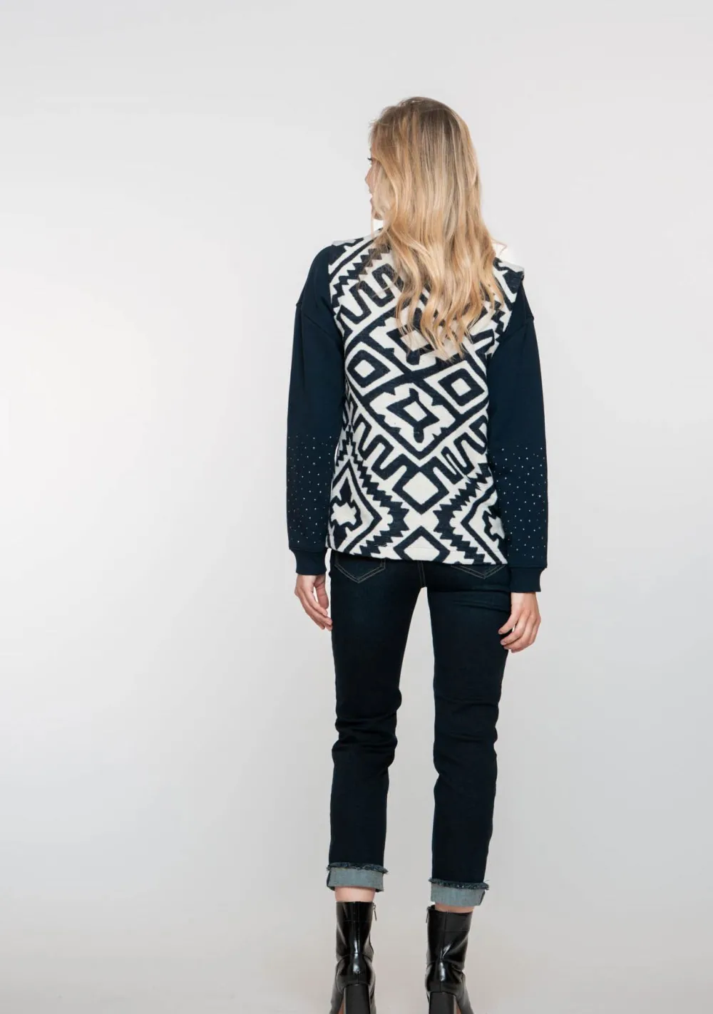 – Het model is 1.76m lang en draagt maat S