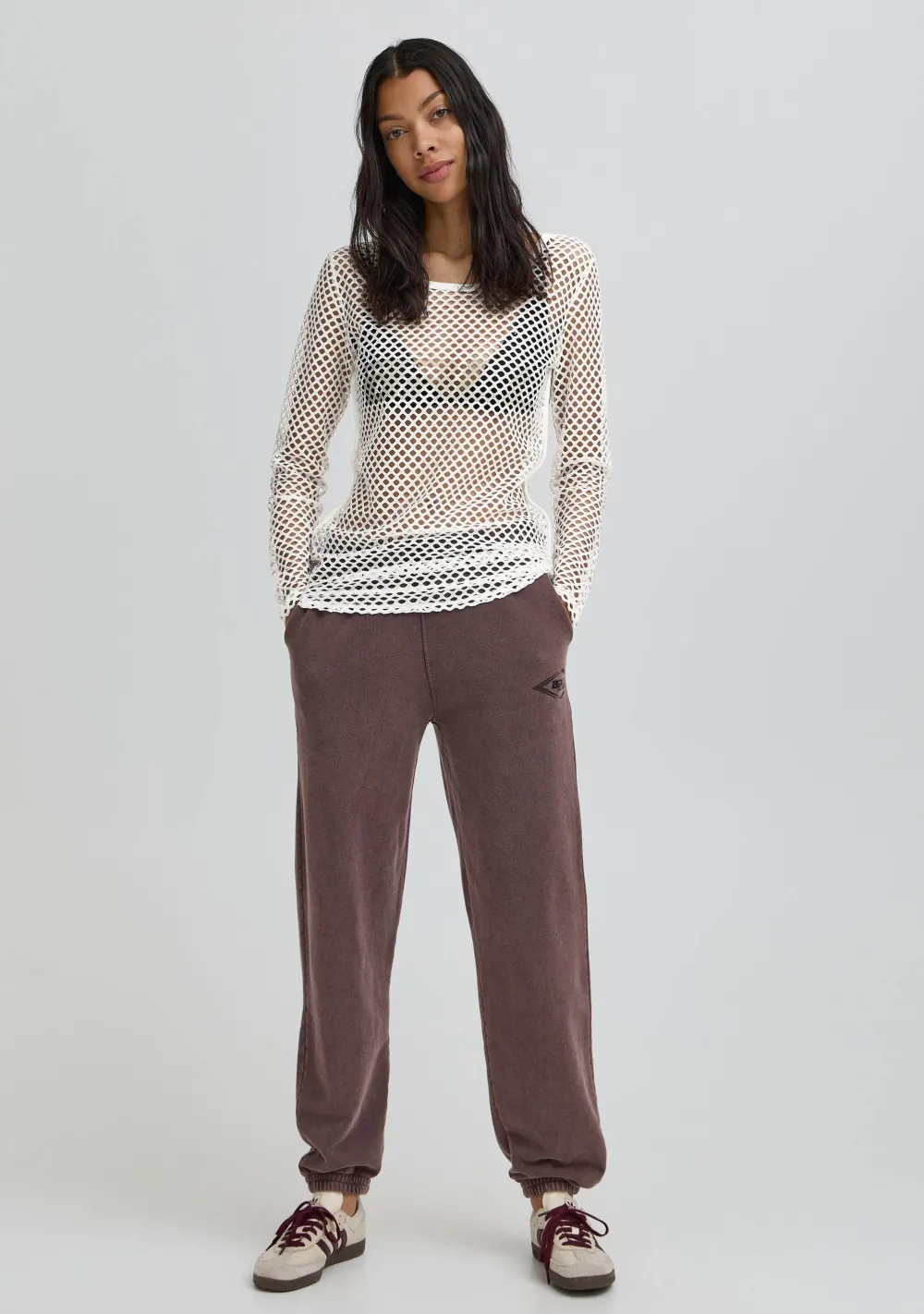 – Het model is 1.76m lang en draagt maat XS