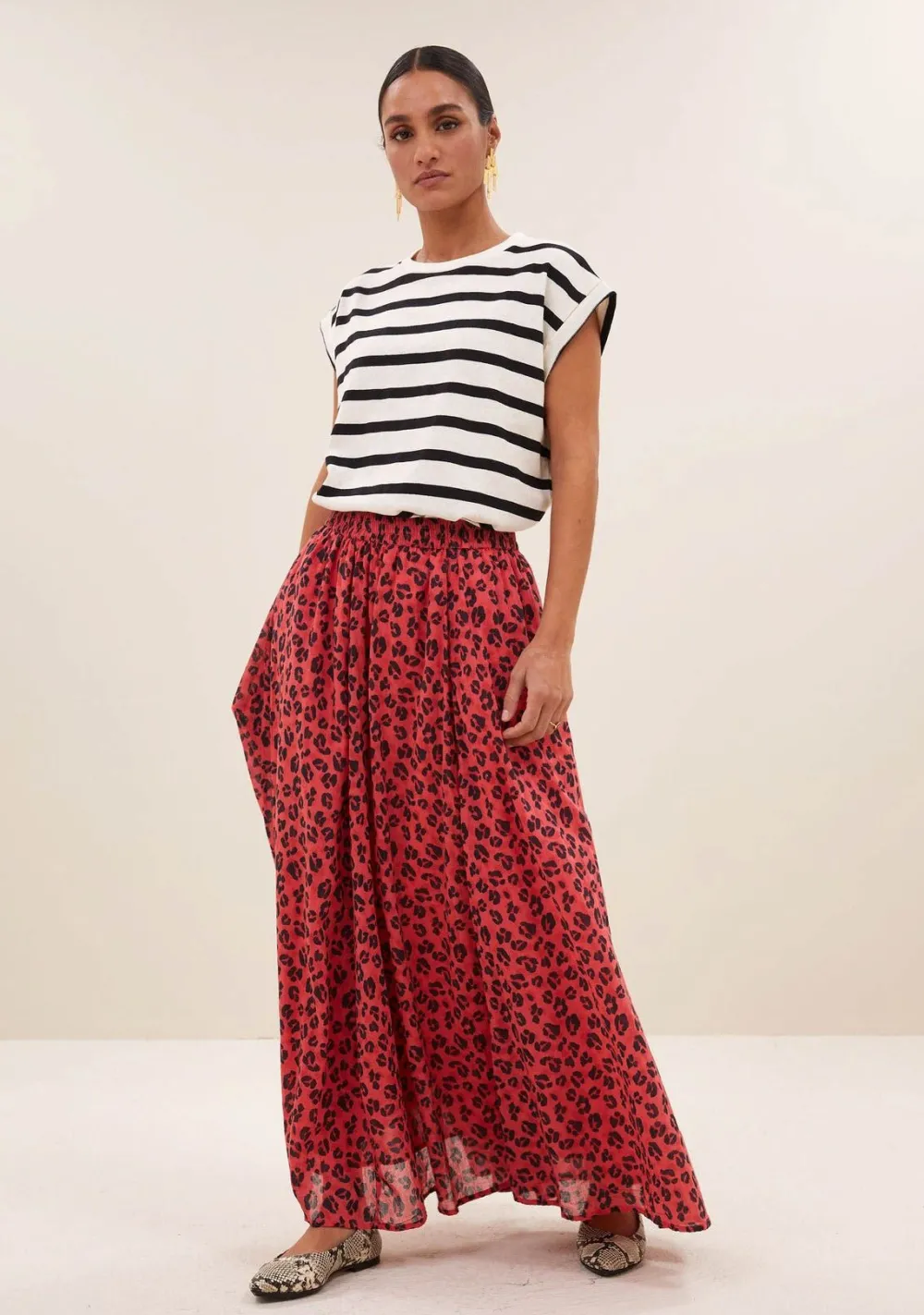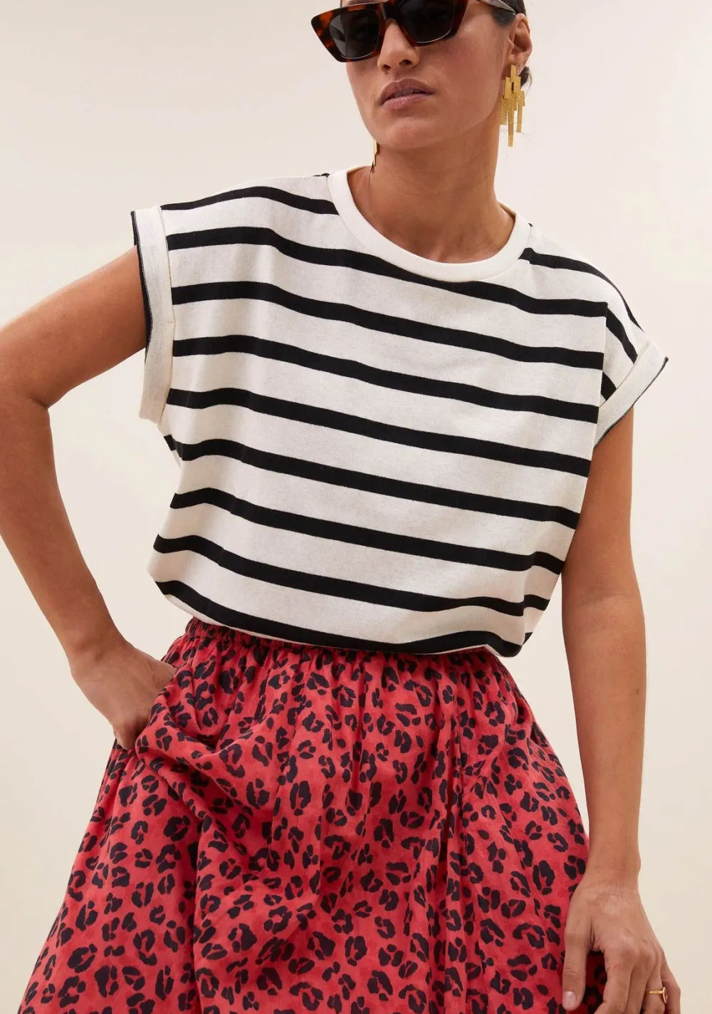 – Het model is 1.75m lang en draagt maat S