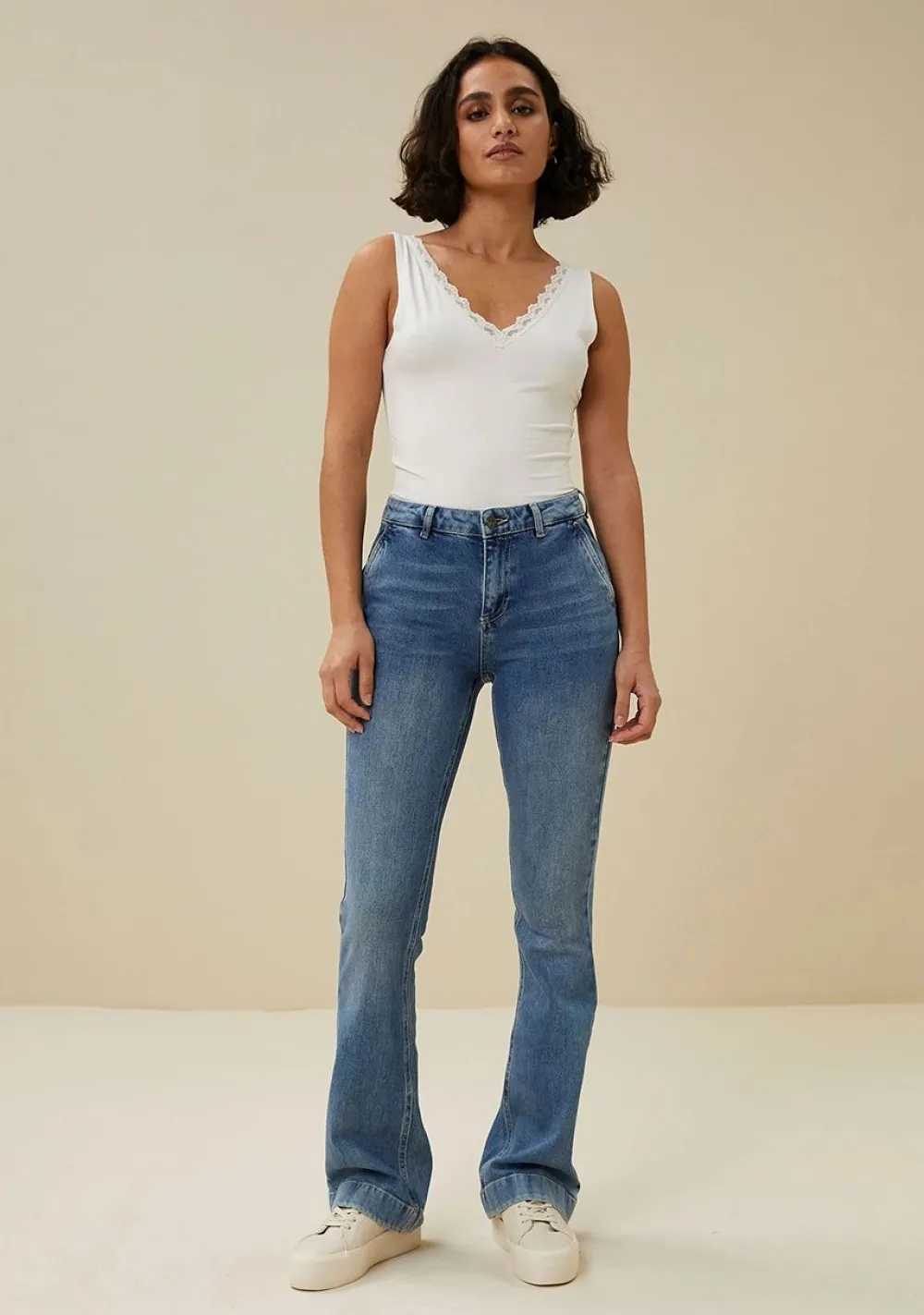 – Het model is 1.76m lang en draagt maat S