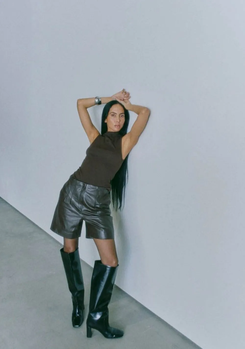 – Het model is 1.76m lang en draagt maat S