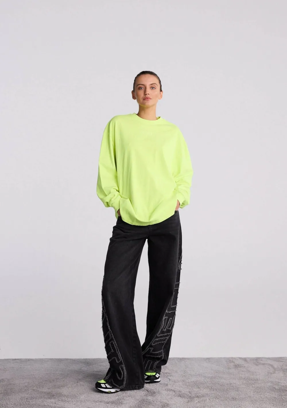 – Het model is 1.78m lang en draagt maat S