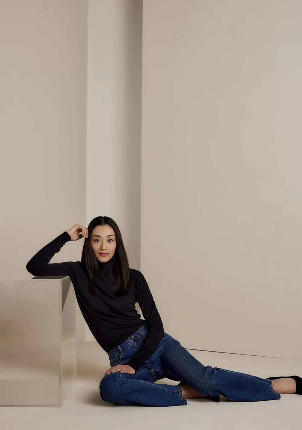 – Het model is 1.76m lang en draagt maat S