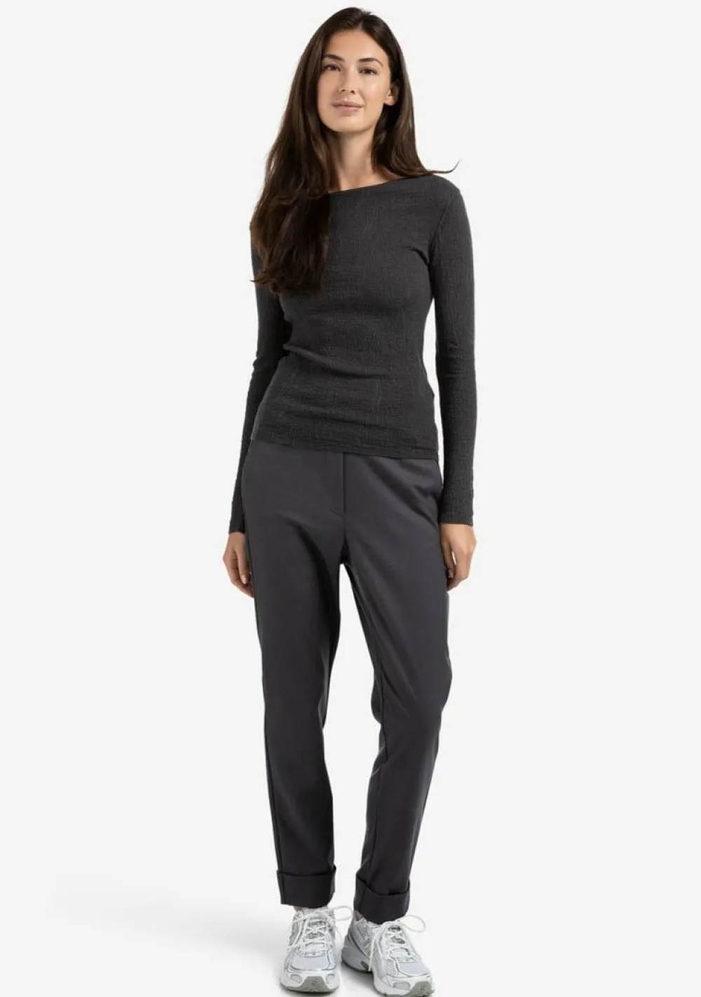 – Het model is 1.76m lang en draagt maat S