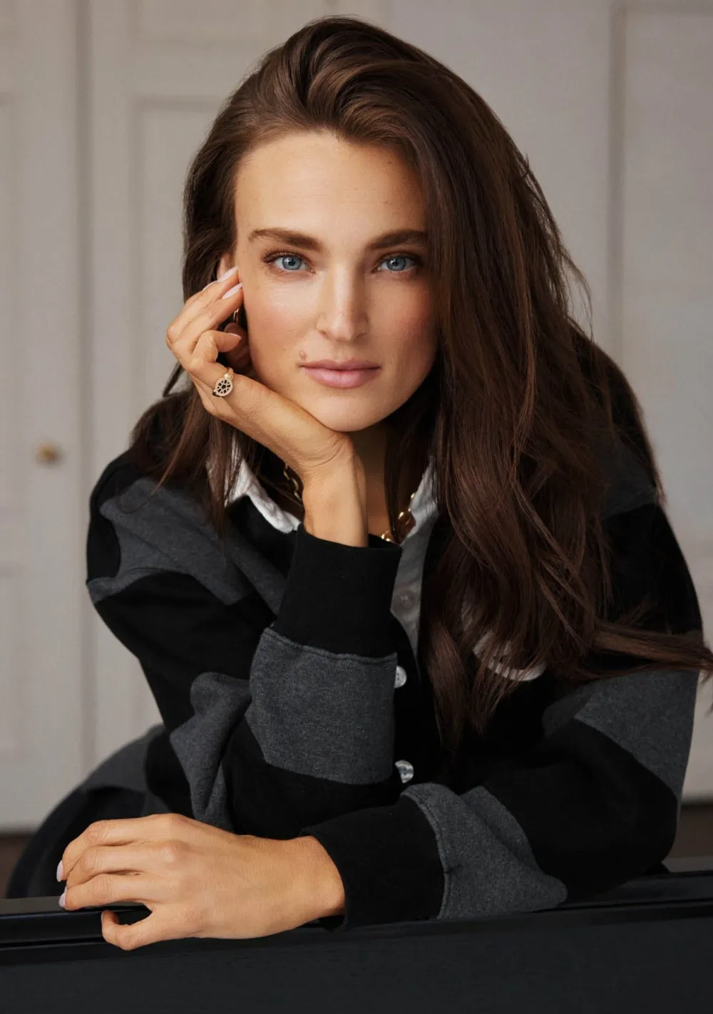 – Het model is 1.77m lang en draagt maat S