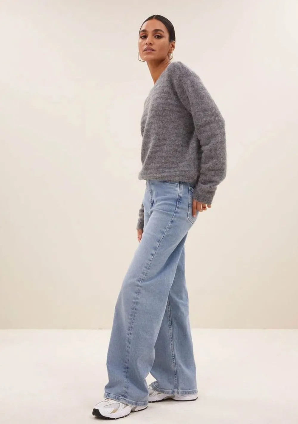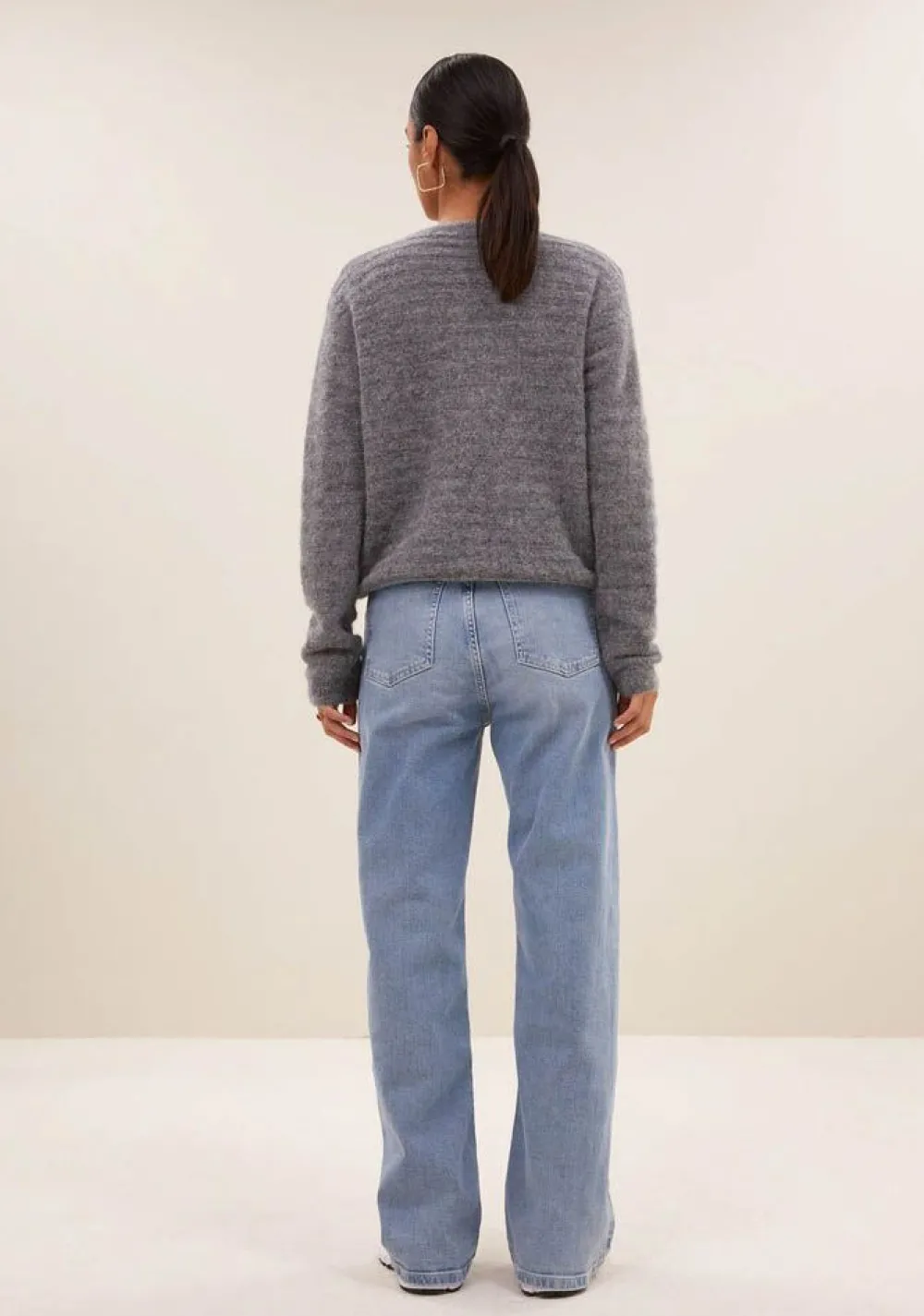– Het model is 1.75m lang en draagt maat S