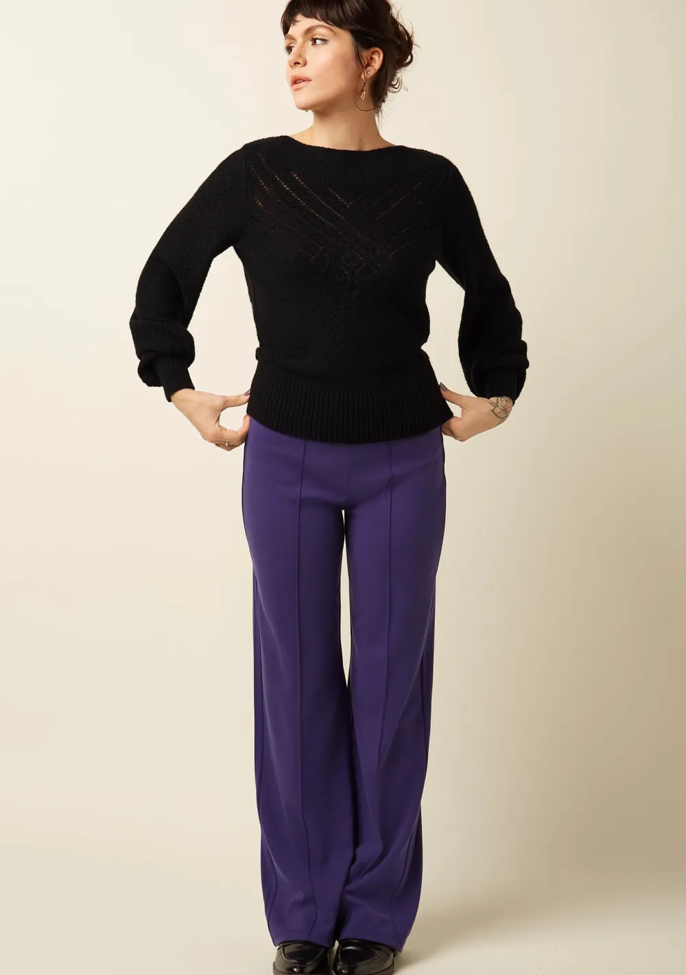 – Het model is 1.76m lang en draagt maat S