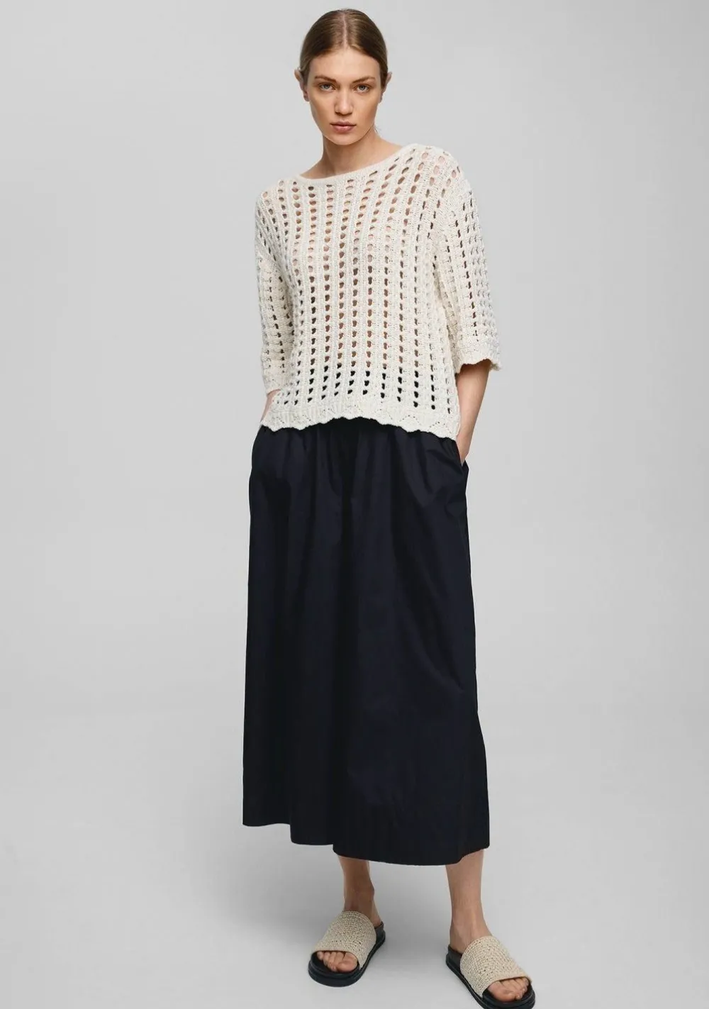 – Het model is 1.79m lang en draagt maat XS/S