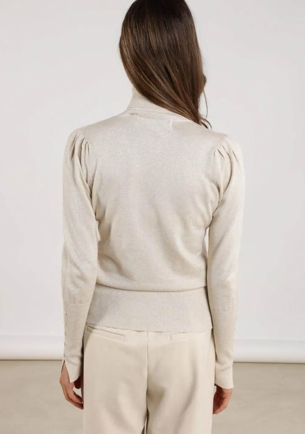 – Het model is 1.76m lang en draagt maat S