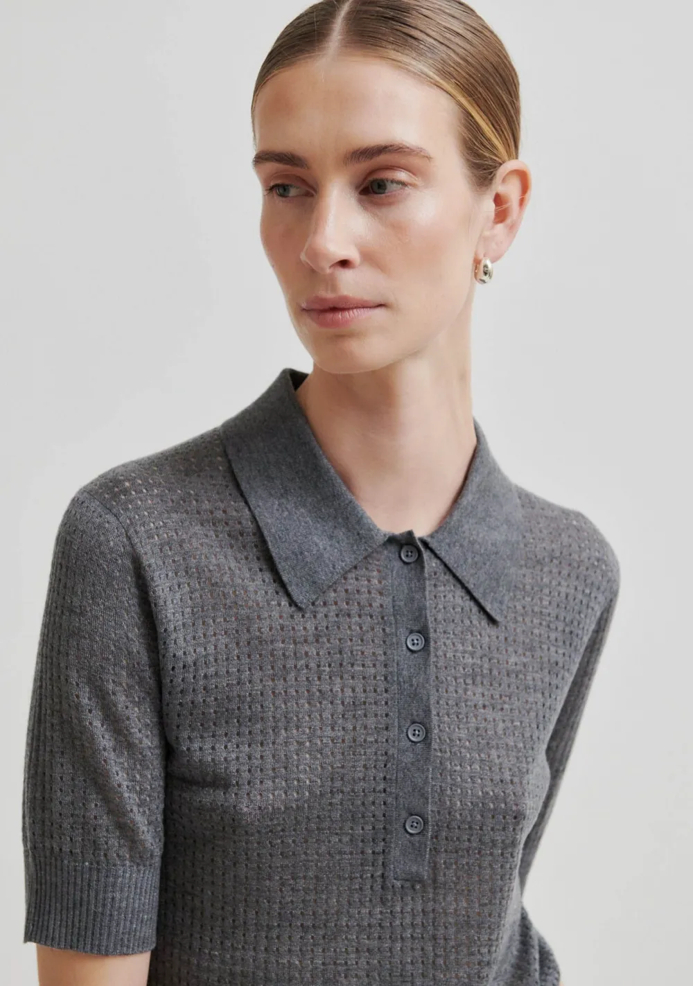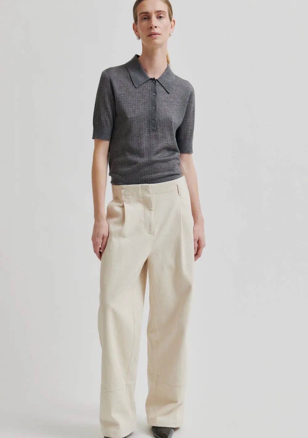 – Het model is 1.76m lang en draagt maat S