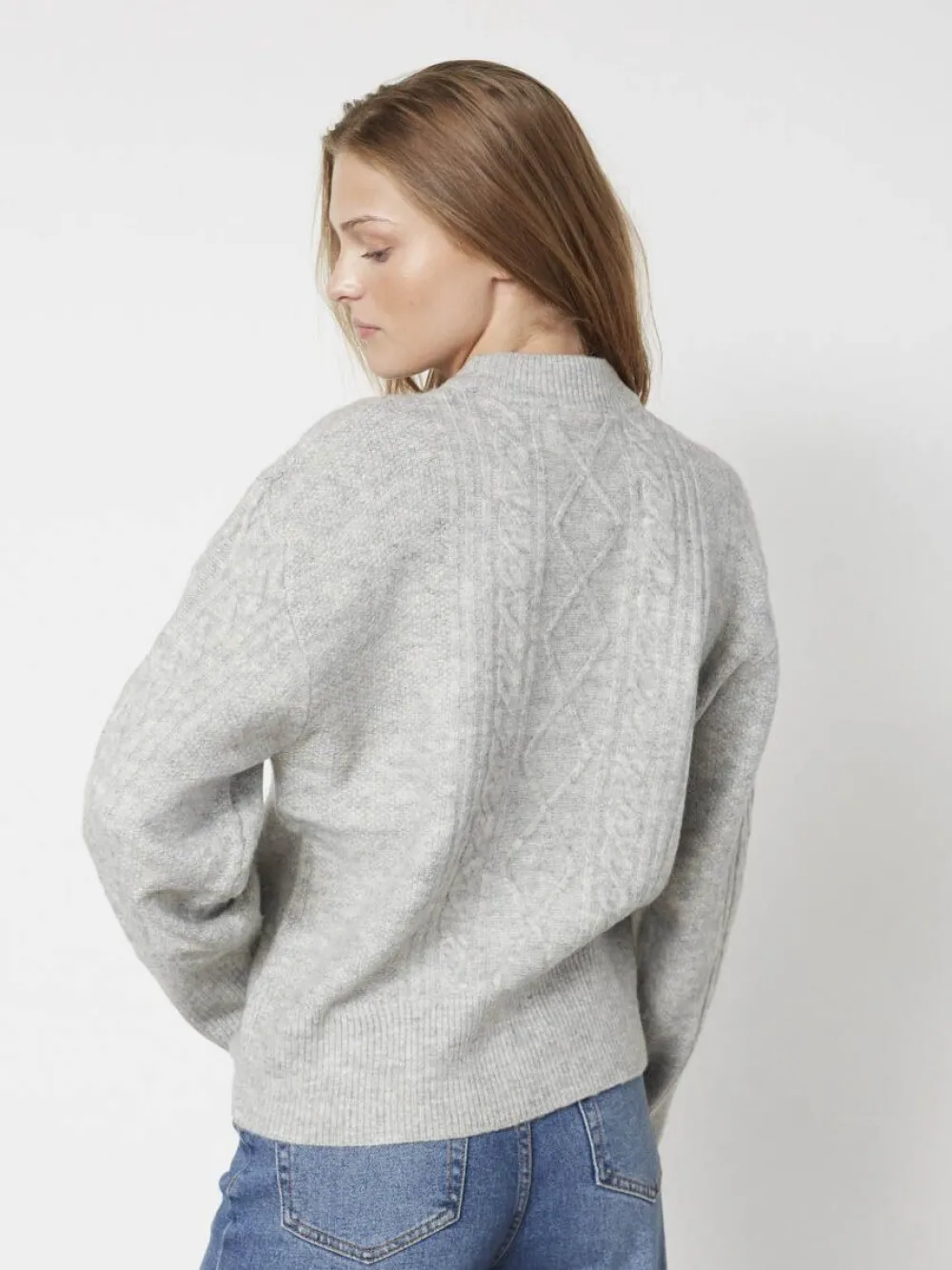 – Het model is 1.76m lang en draagt maat S
