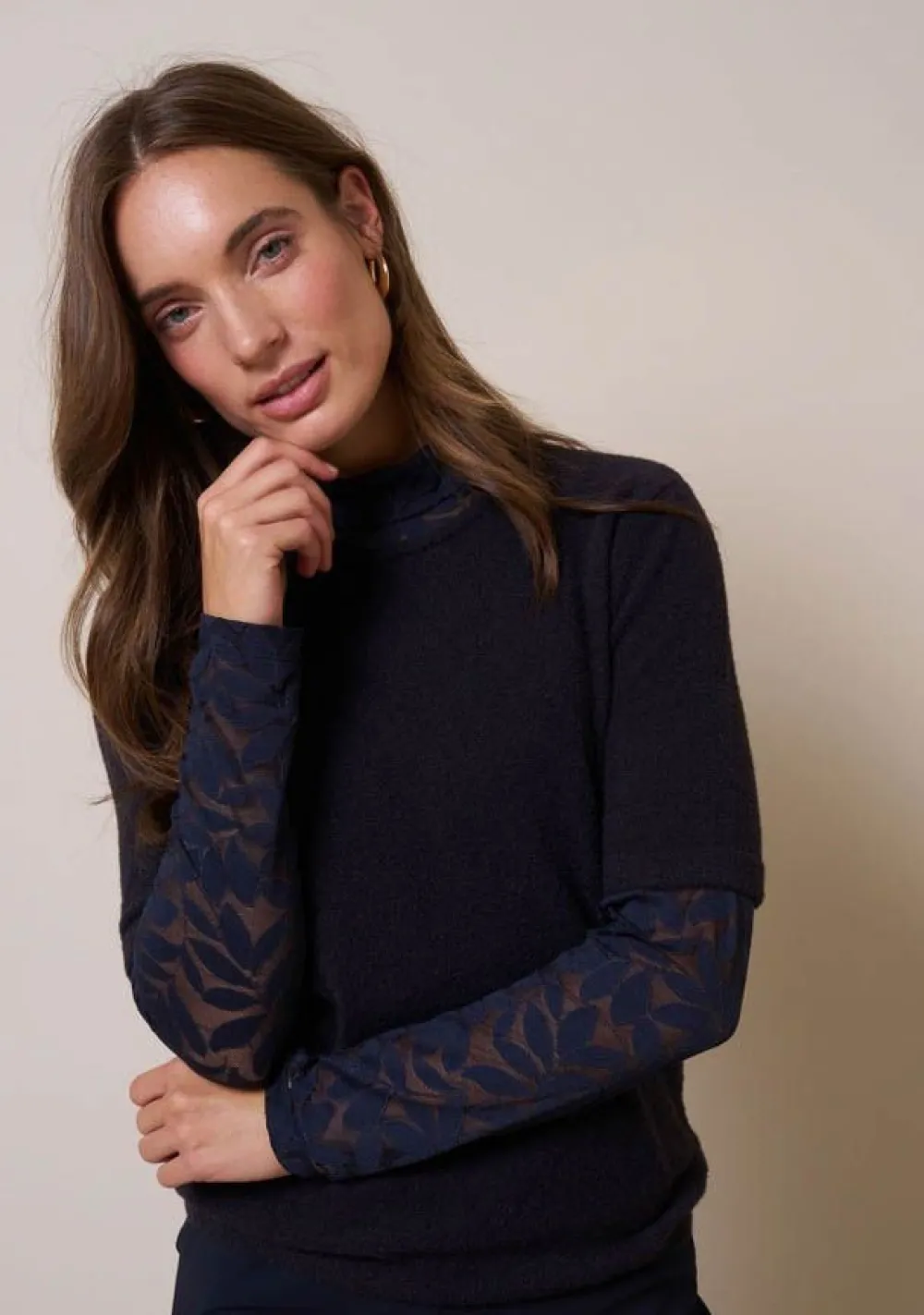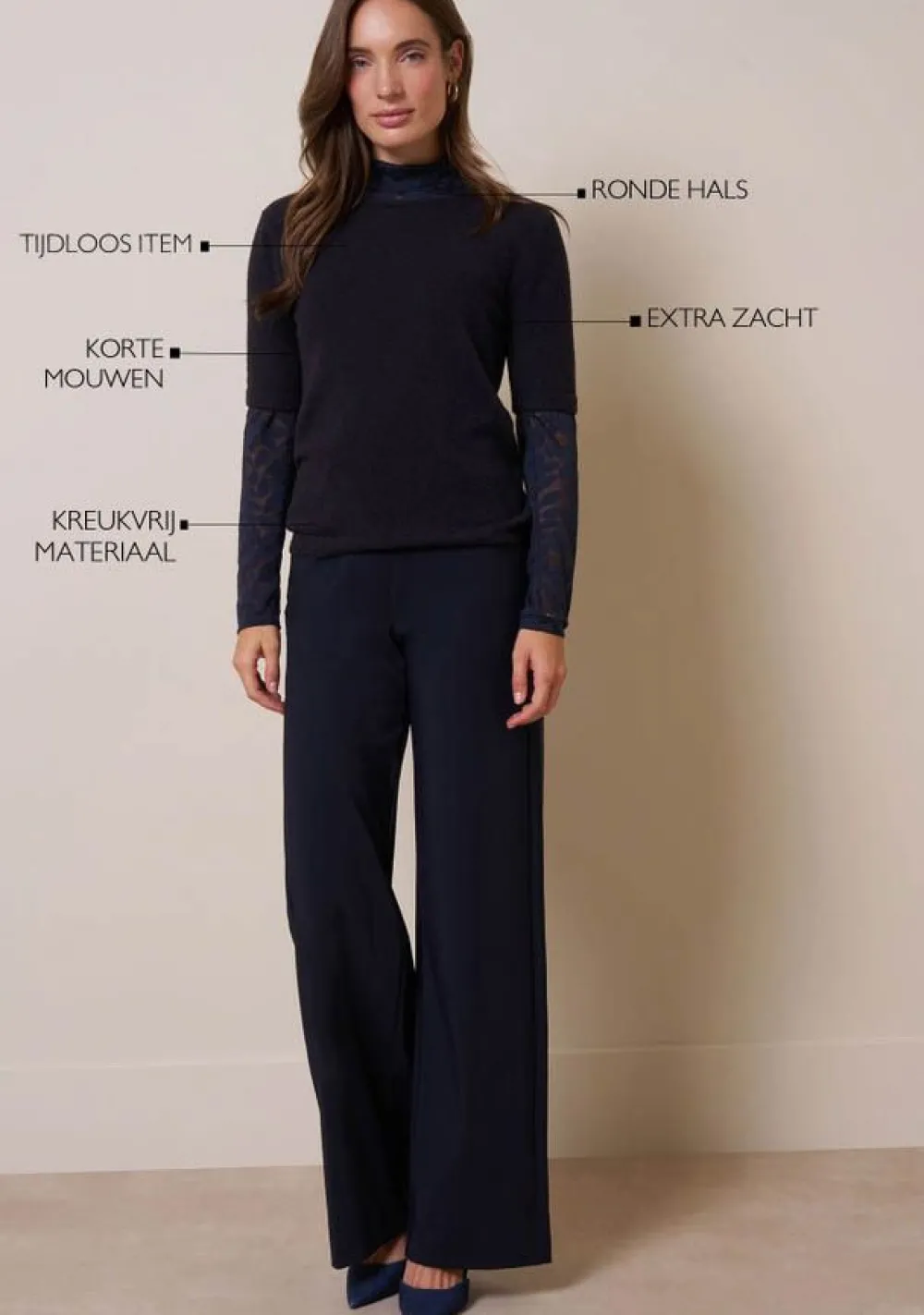 – Het model is 1.76m lang en draagt maat S
