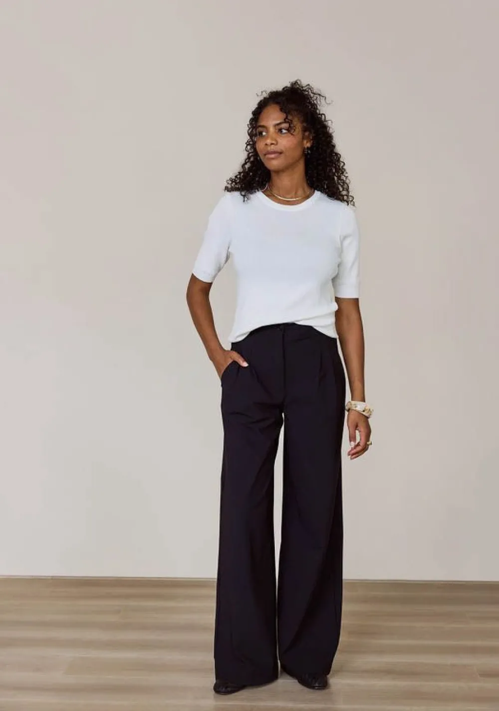 – Het model is 1.76m lang en draagt maat S