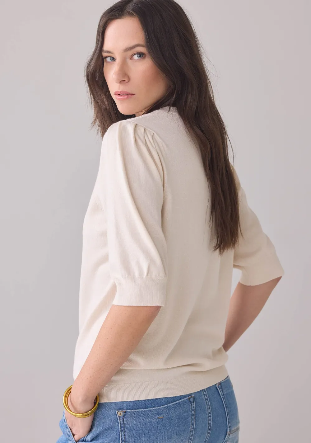 – Het model is 1.76m lang en draagt maat S