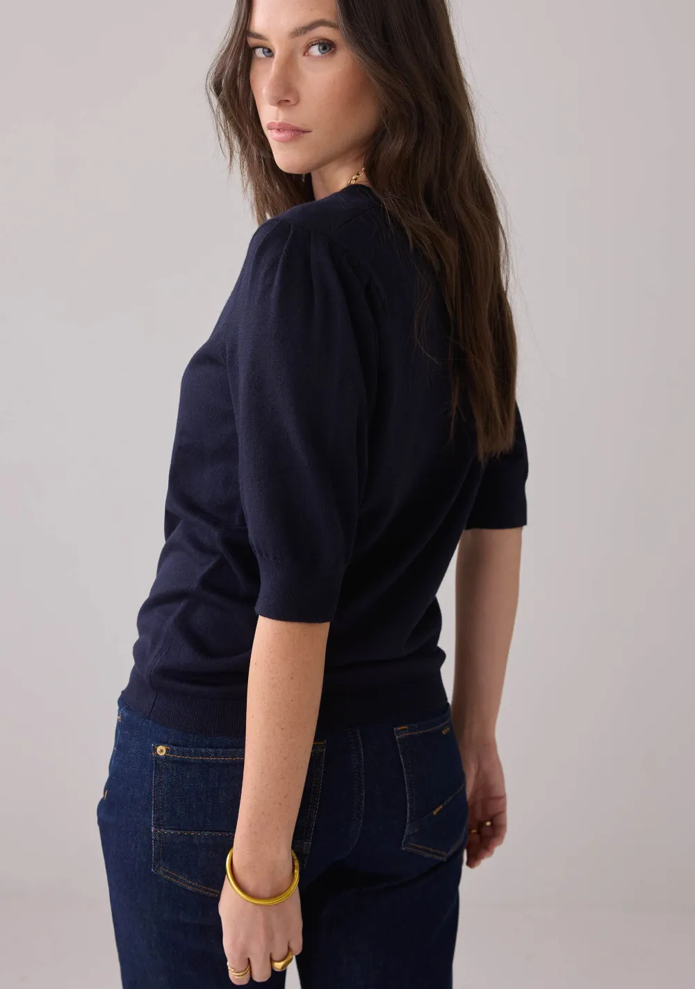 – Het model is 1.76m lang en draagt maat S