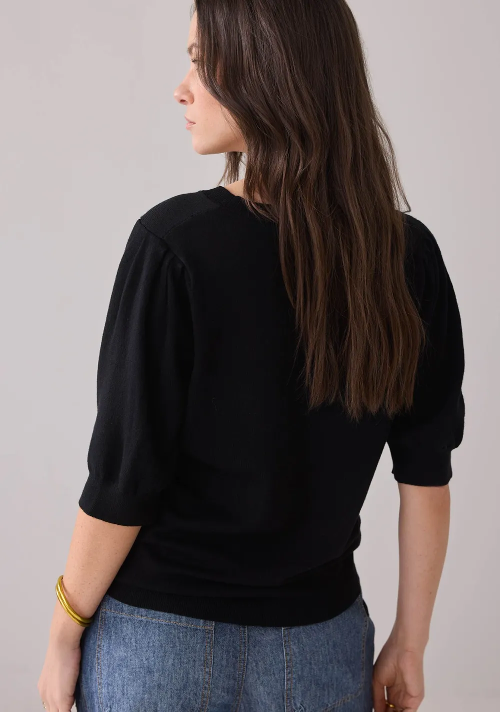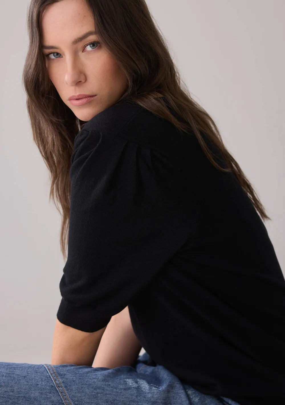 – Het model is 1.76m lang en draagt maat S