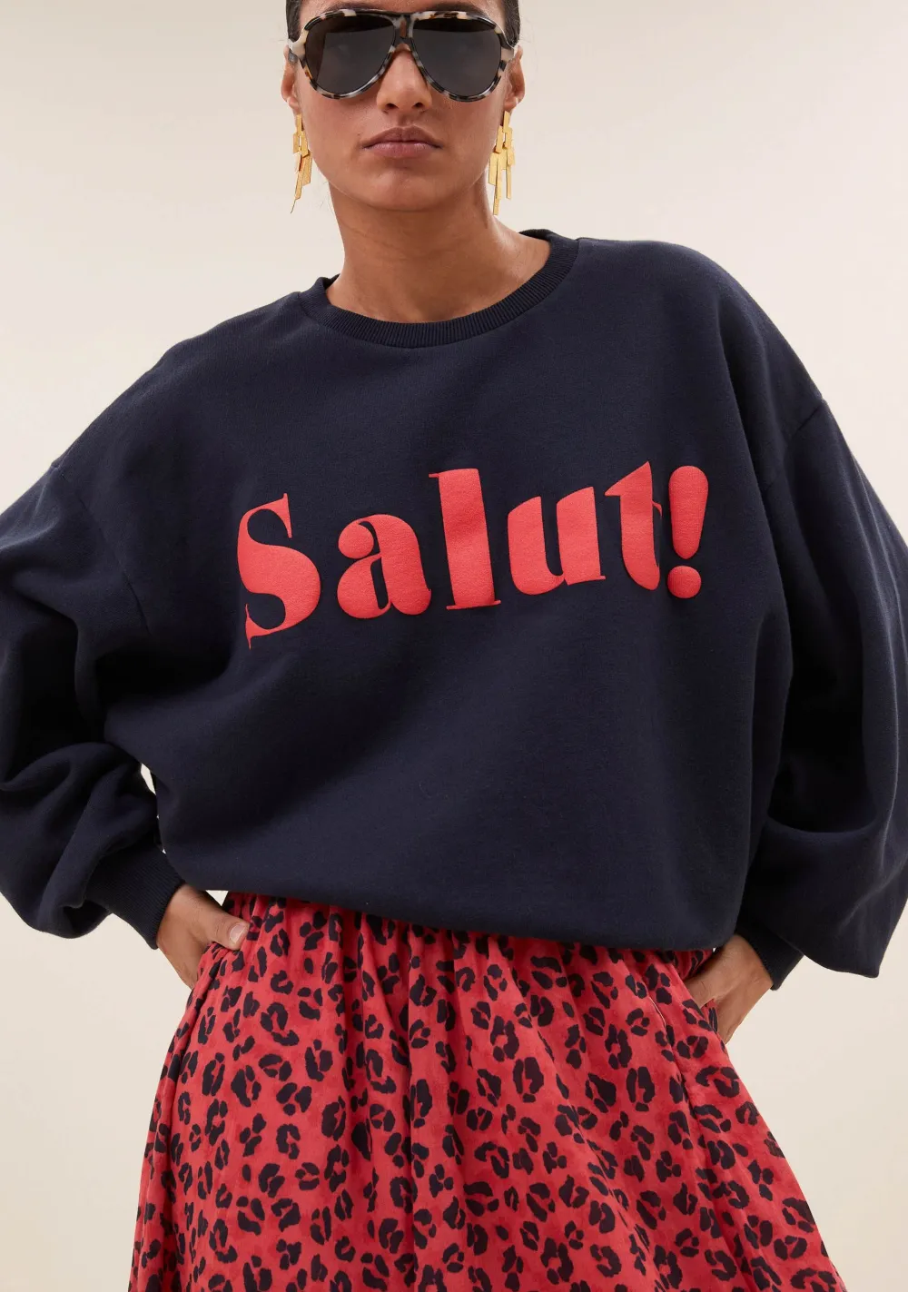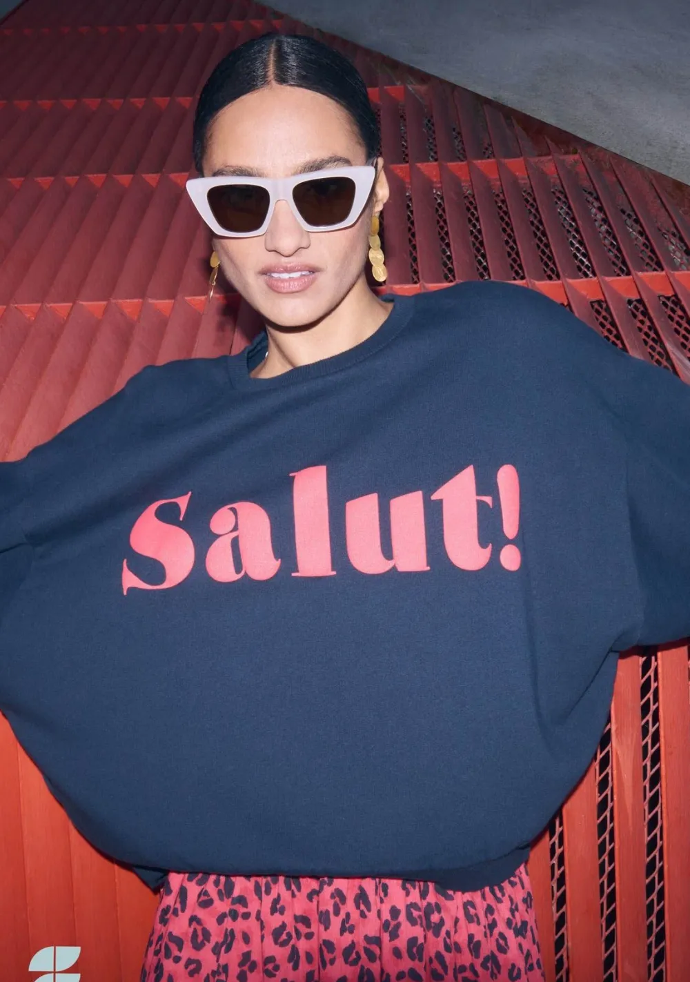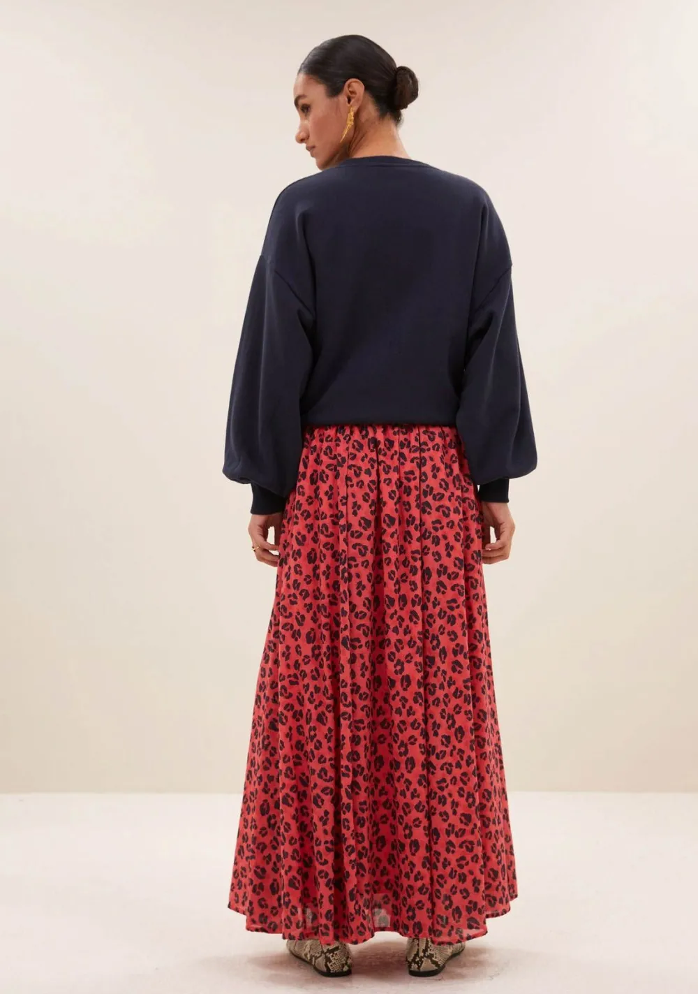 – Het model is 1.75m lang en draagt maat S