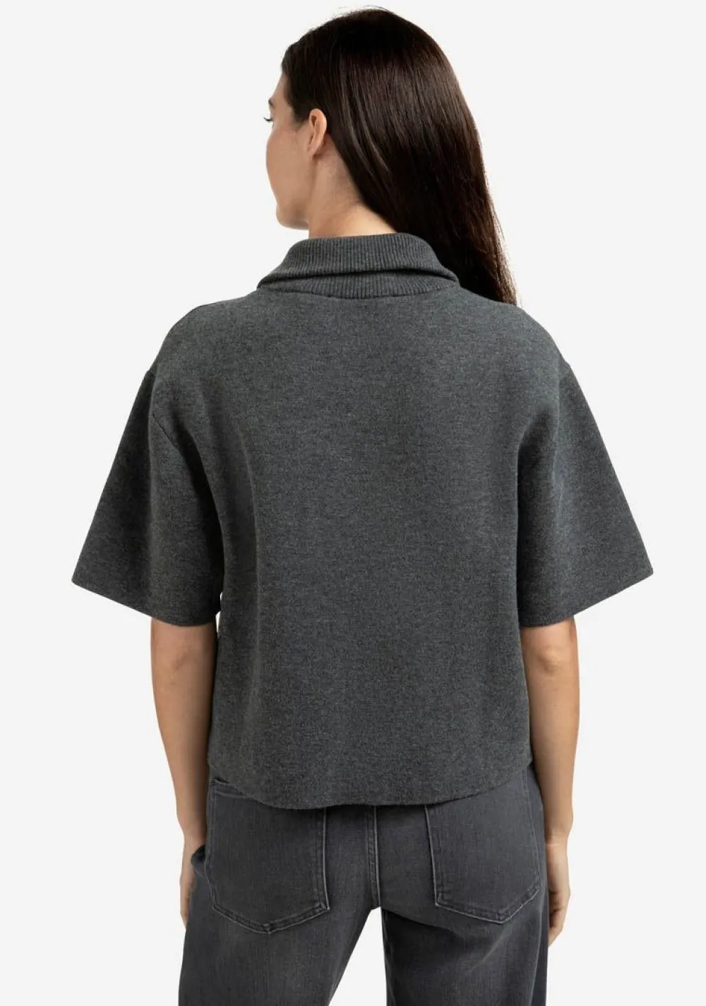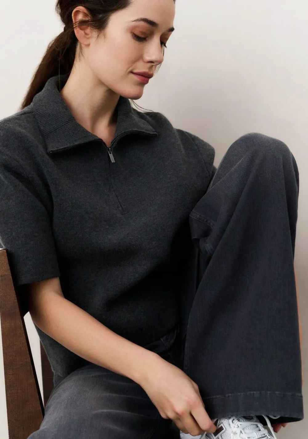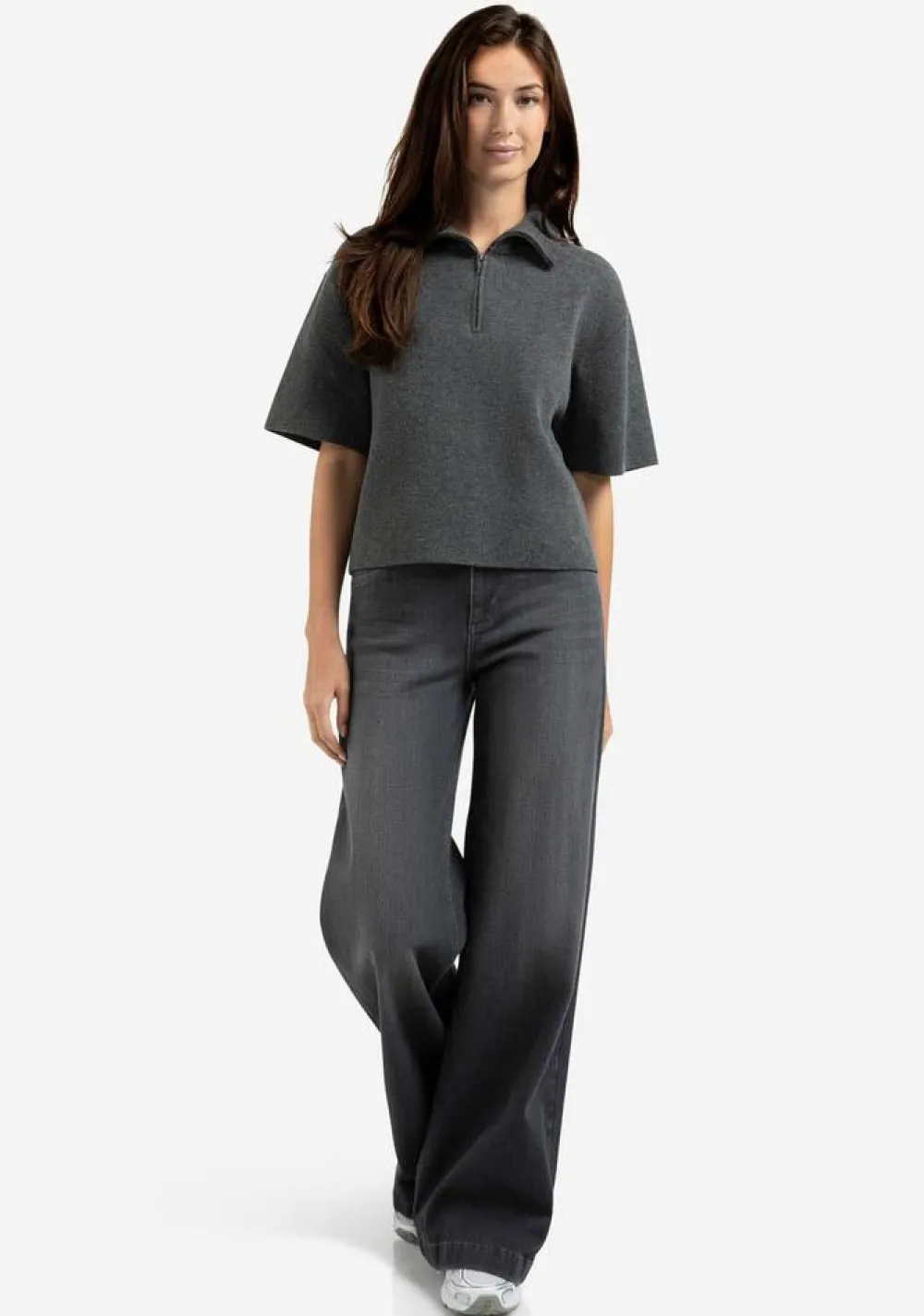 – Het model is 1.75m lang en draagt maat S