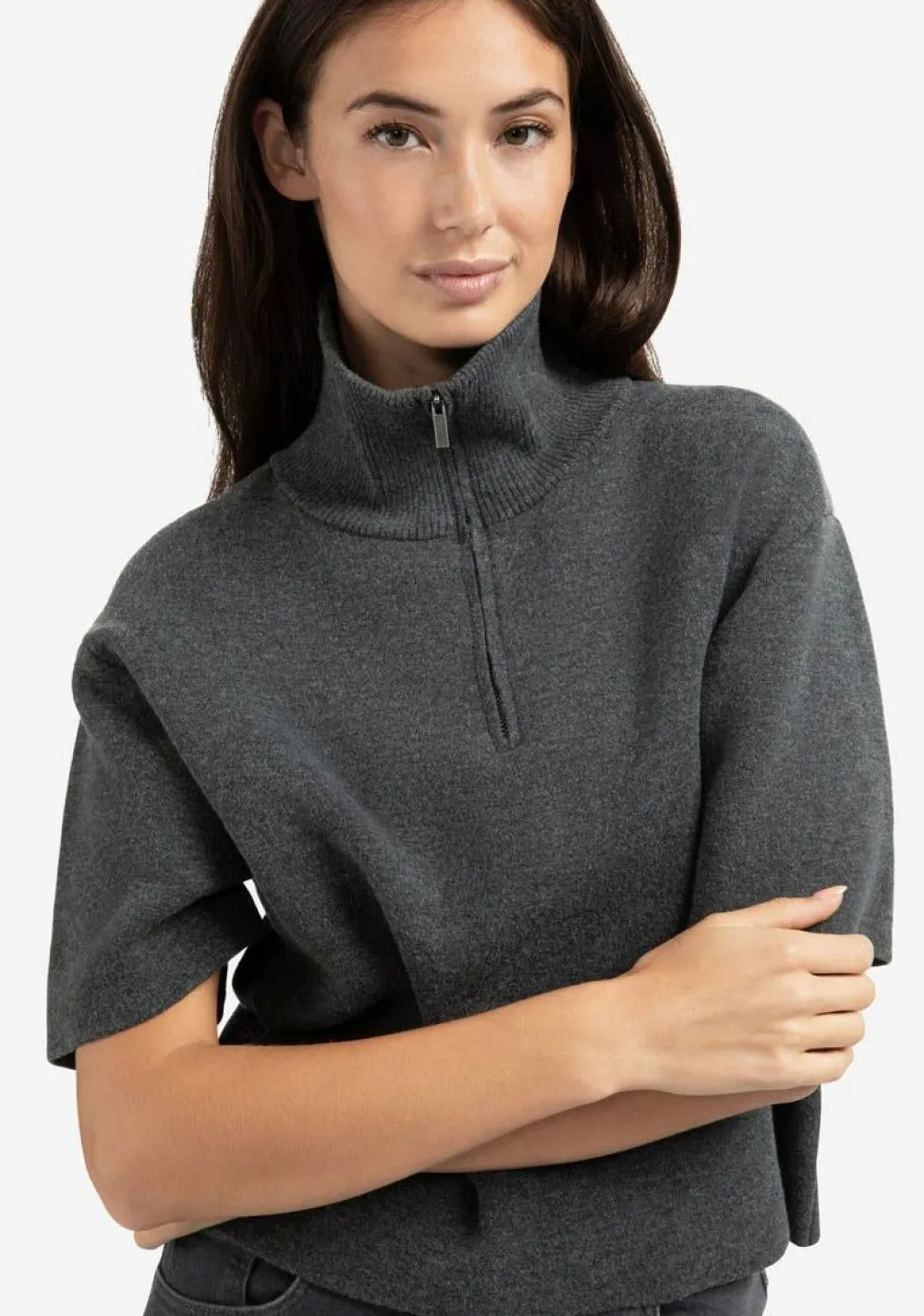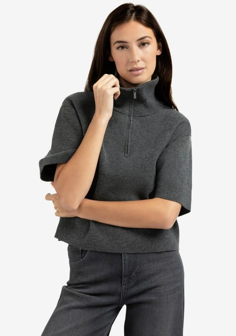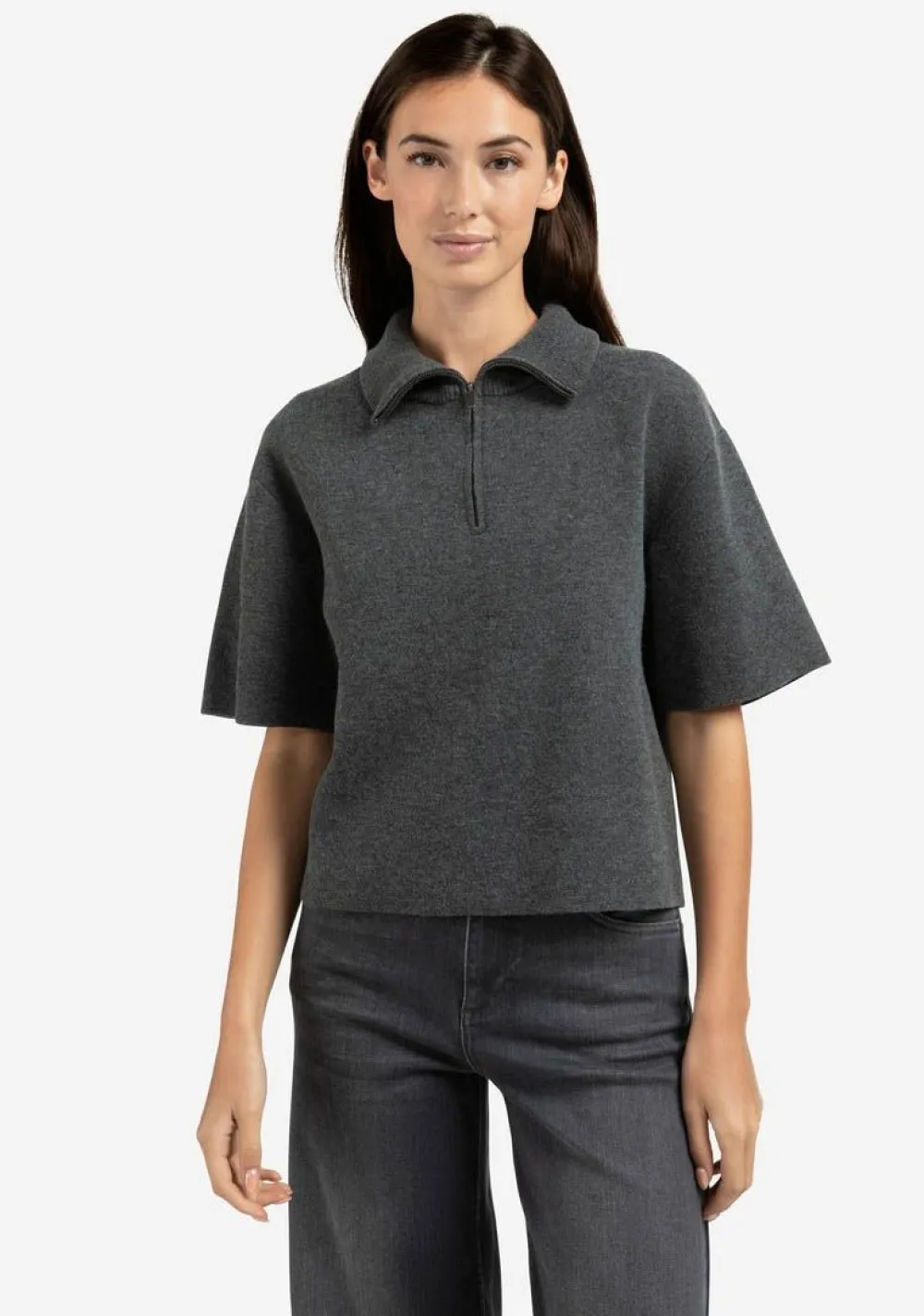 – Het model is 1.75m lang en draagt maat S