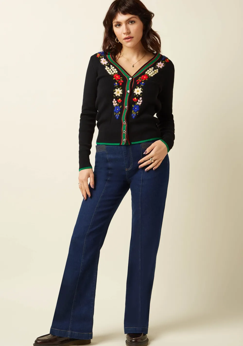 – Het model is 1.65m lang en draagt maat S