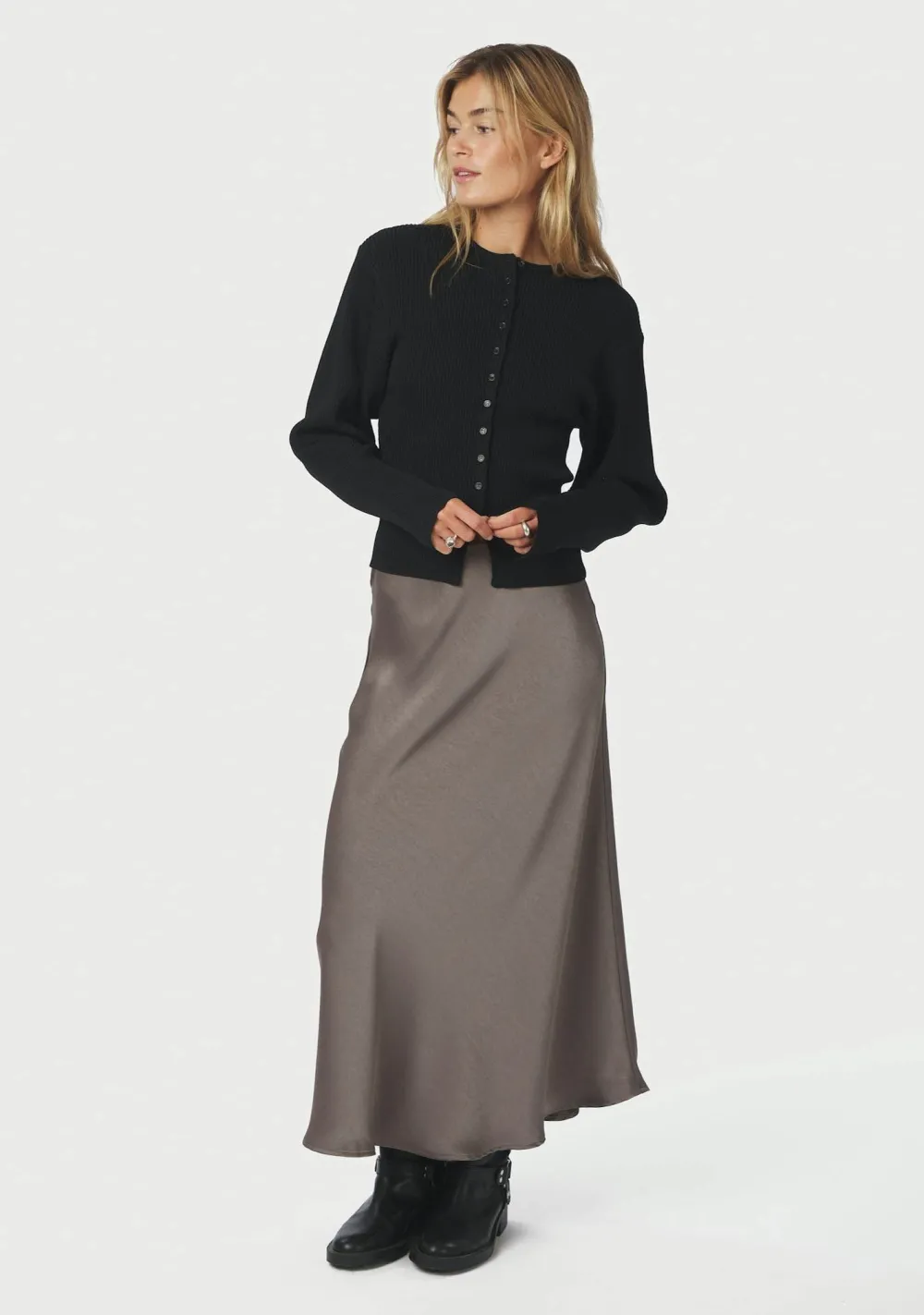 – Het model is 1.76m lang en draagt maat 36