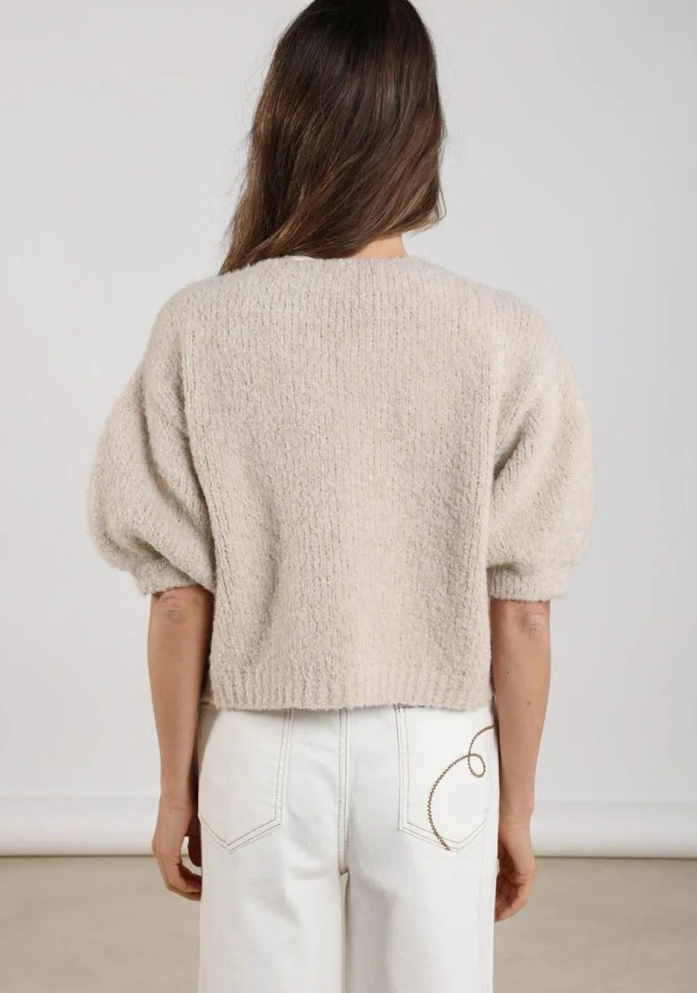 – Het model is 1.76m lang en draagt maat S