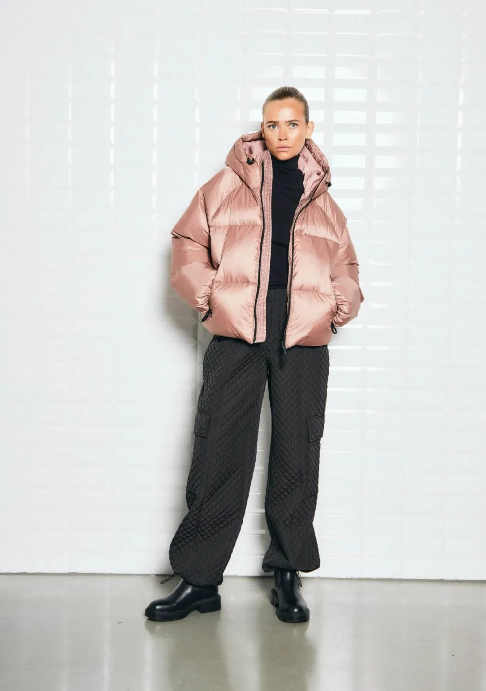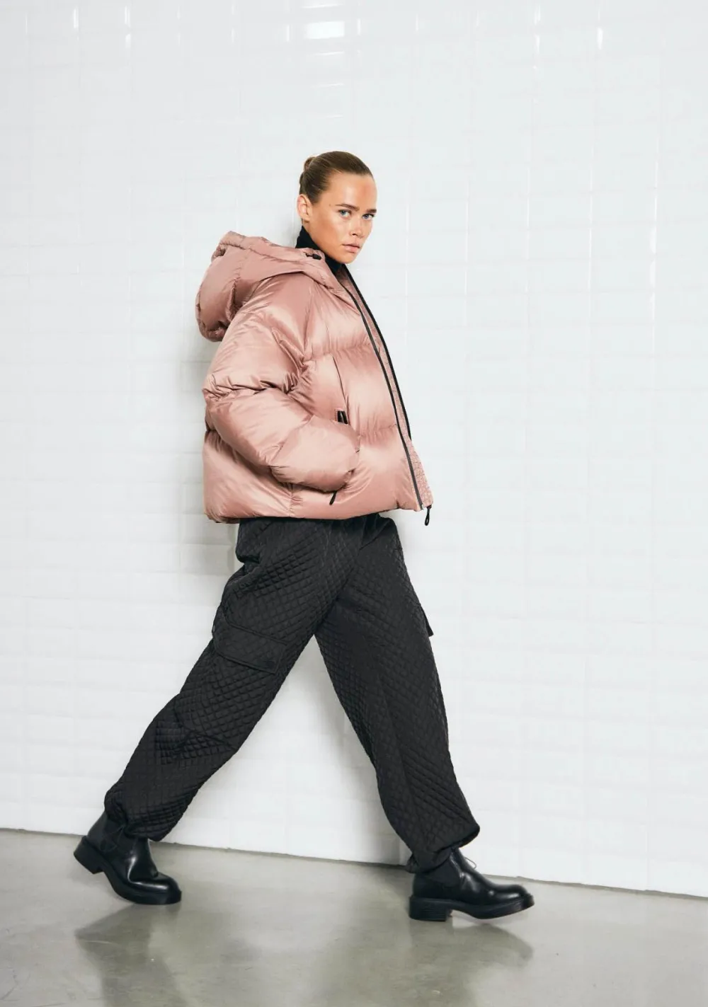 – Het model is 1.72m lang en draagt maat S