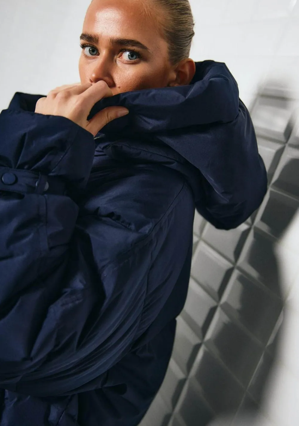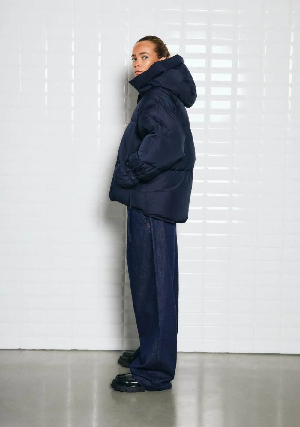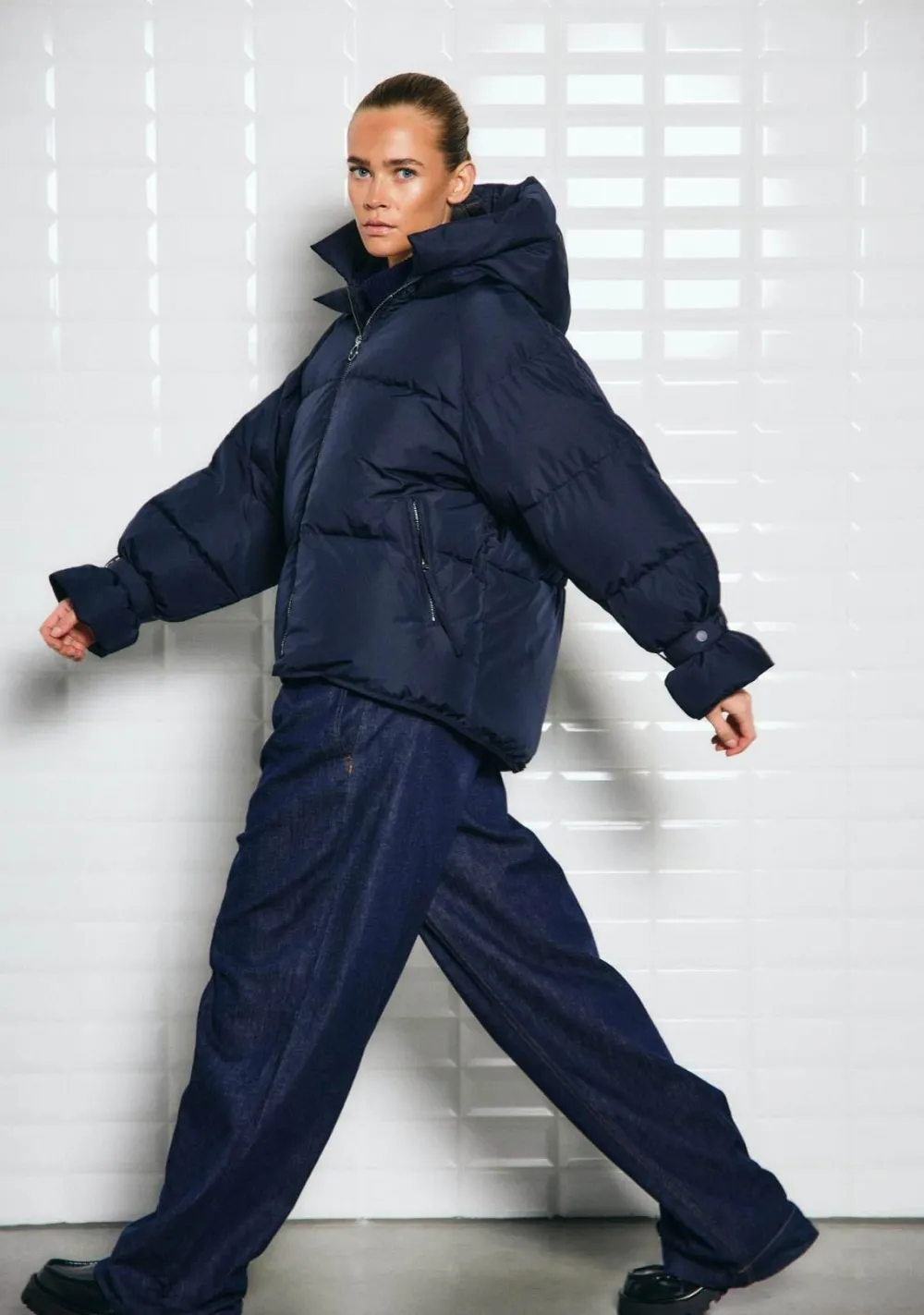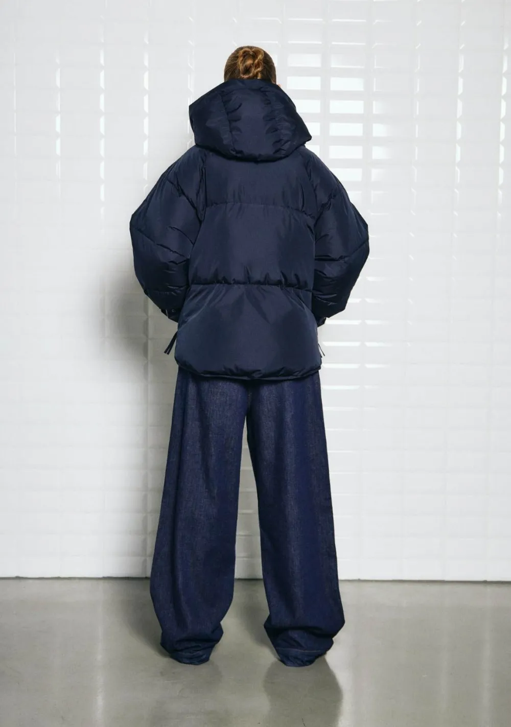 – Het model is 1.72m lang en draagt maat S