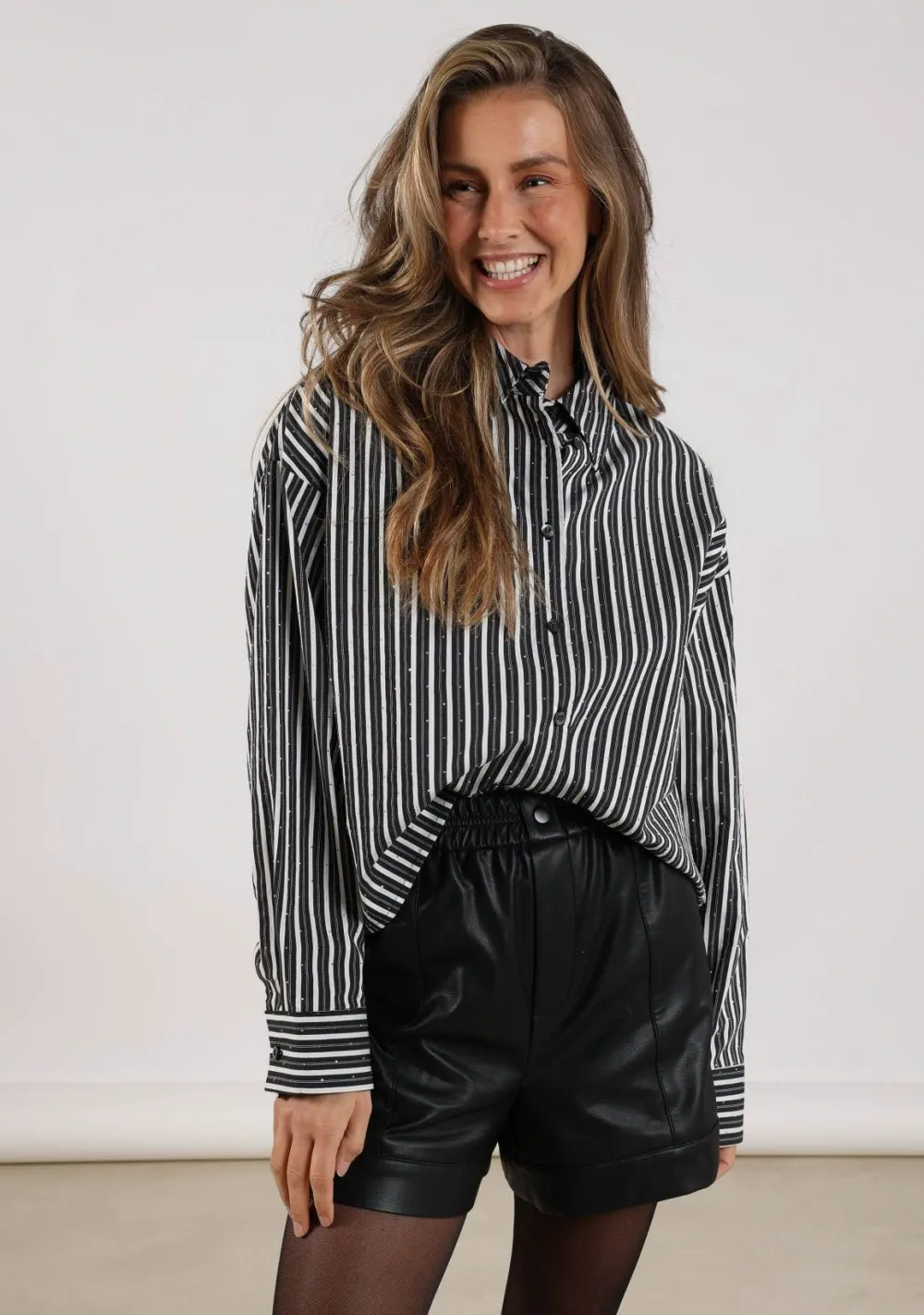 – Het model is 1.76m lang en draagt maat S