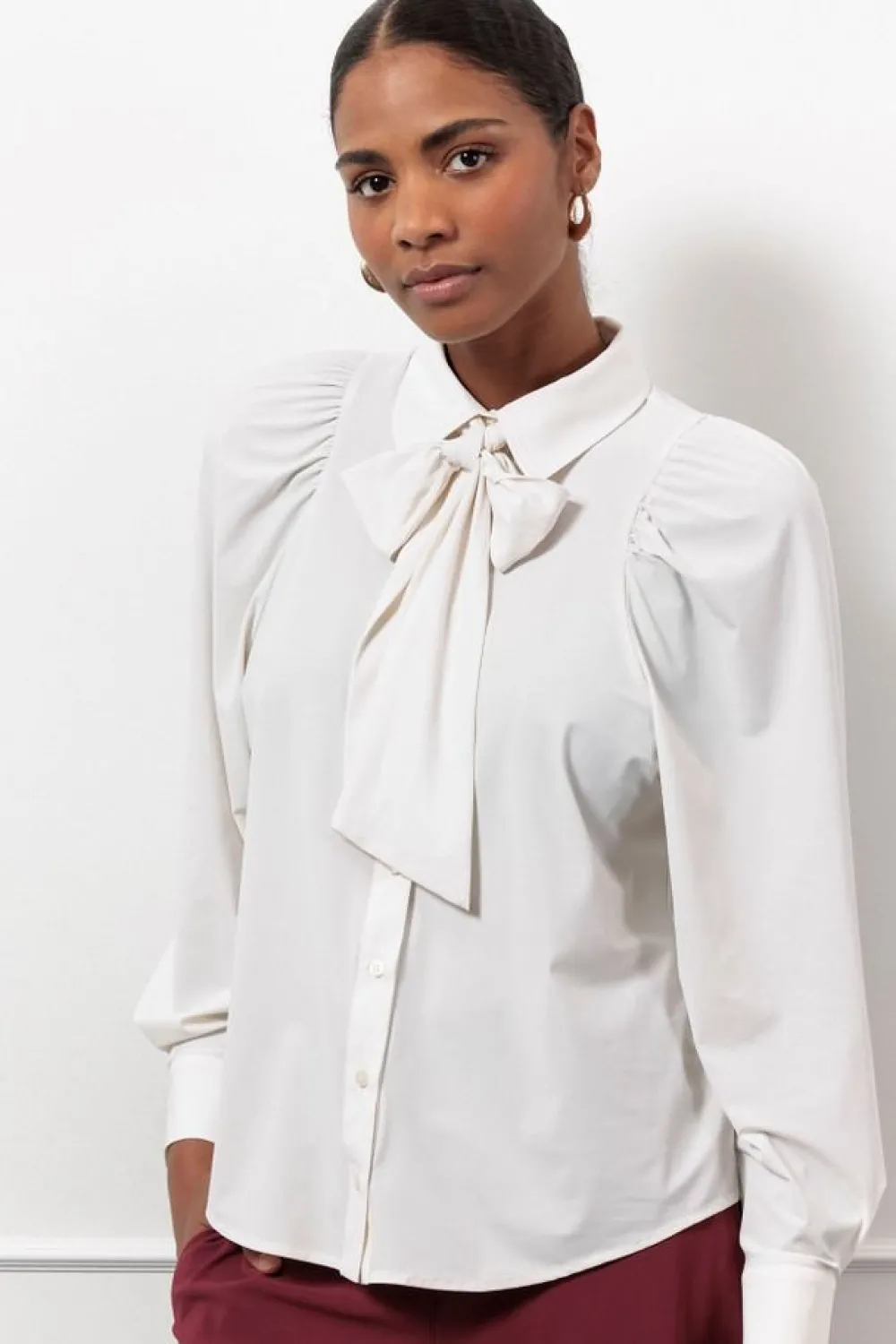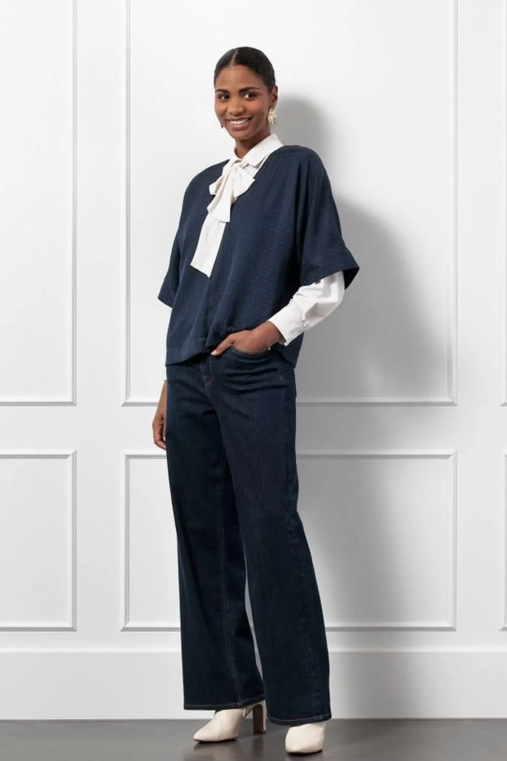 – Het model is 1.76m lang en draagt maat S