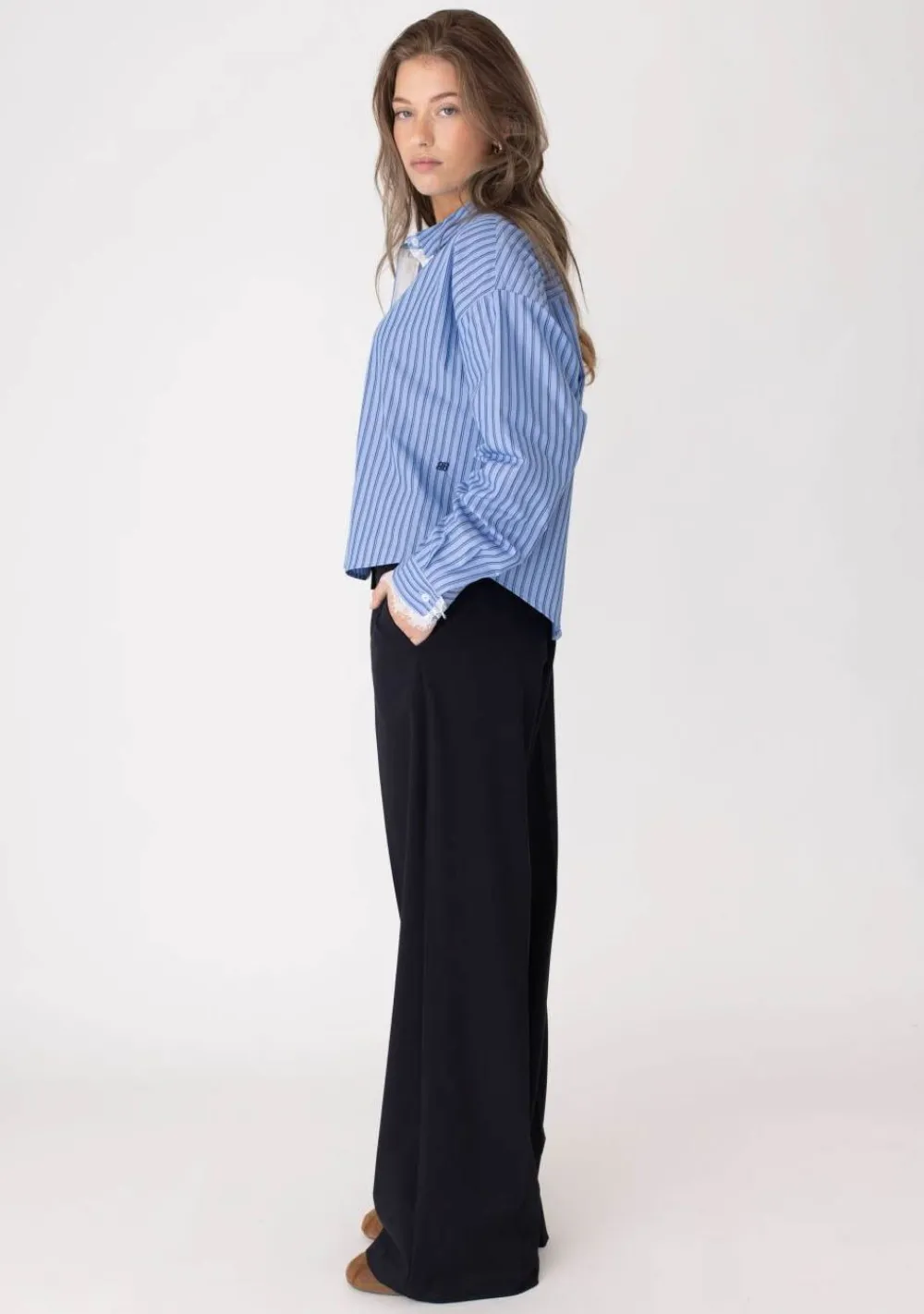 – Het model is 1.76m lang en draagt maat S