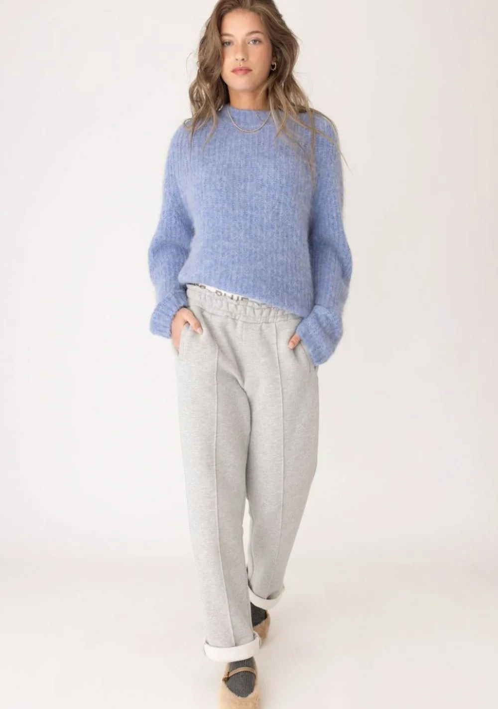 – Het model is 1.76m lang en draagt maat S