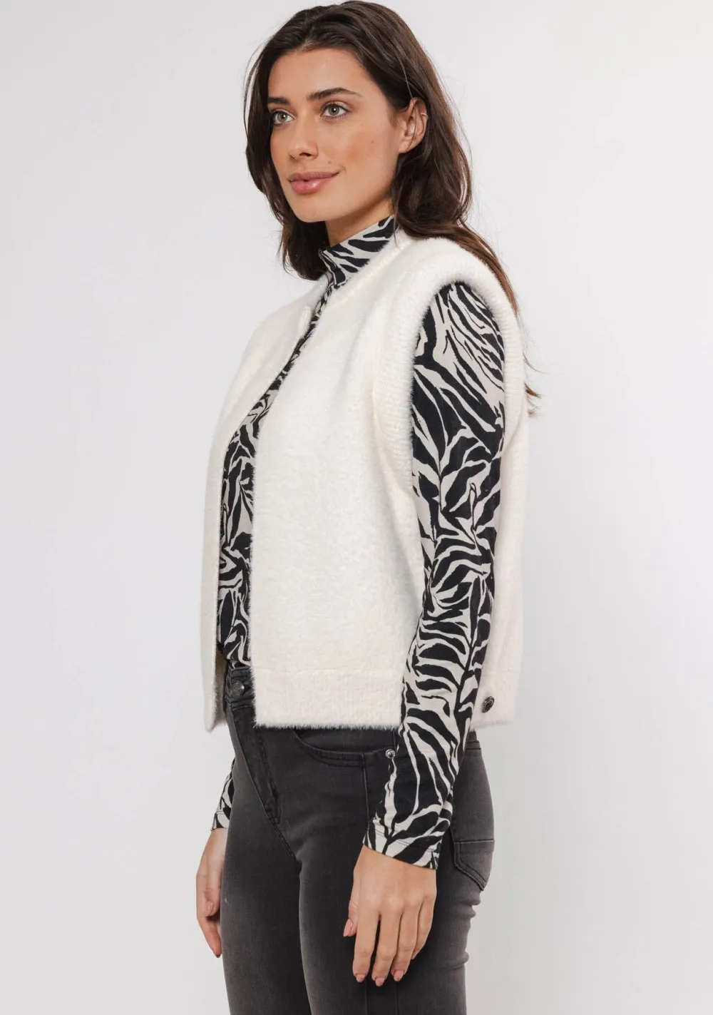 – Het model is 1.76m lang en draagt maat S