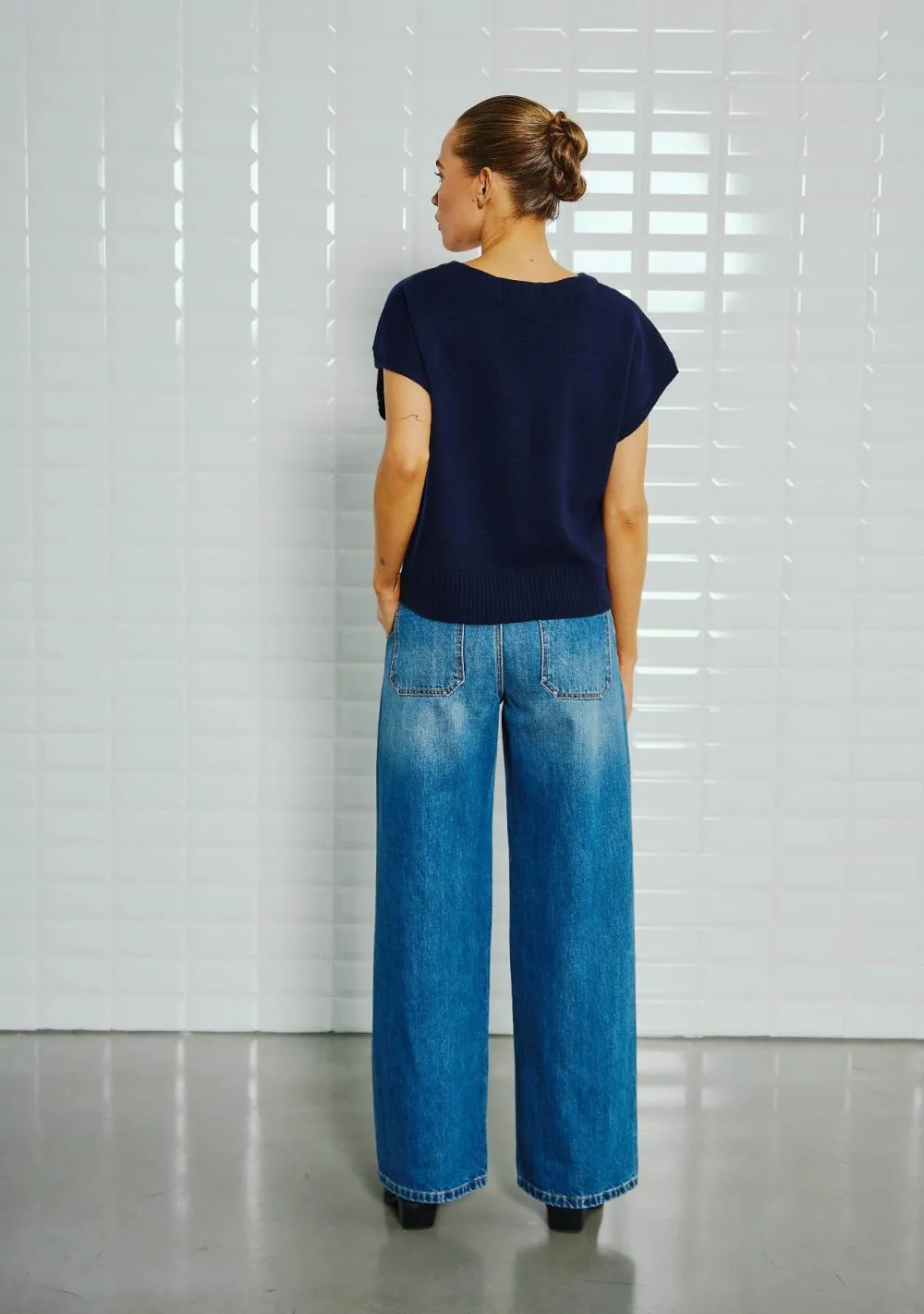 – Het model is 1.72m lang en draagt maat S
