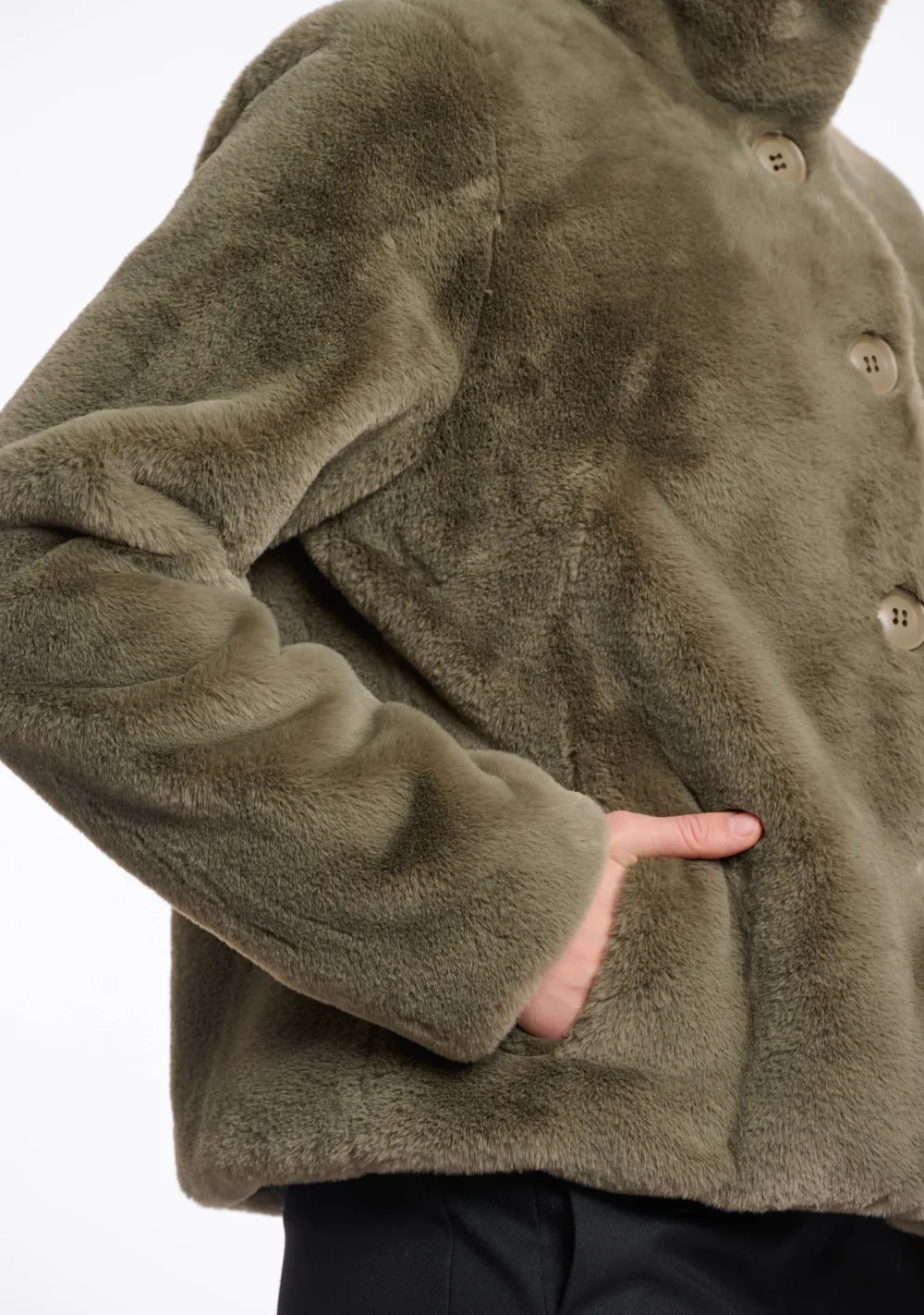 Let op: de kleur van de groene jas kan op de foto’s afwijken. De jas is in werkelijkheid kaki van kleur, maar kan op de foto’s soms een bruine tint lijken te hebben.