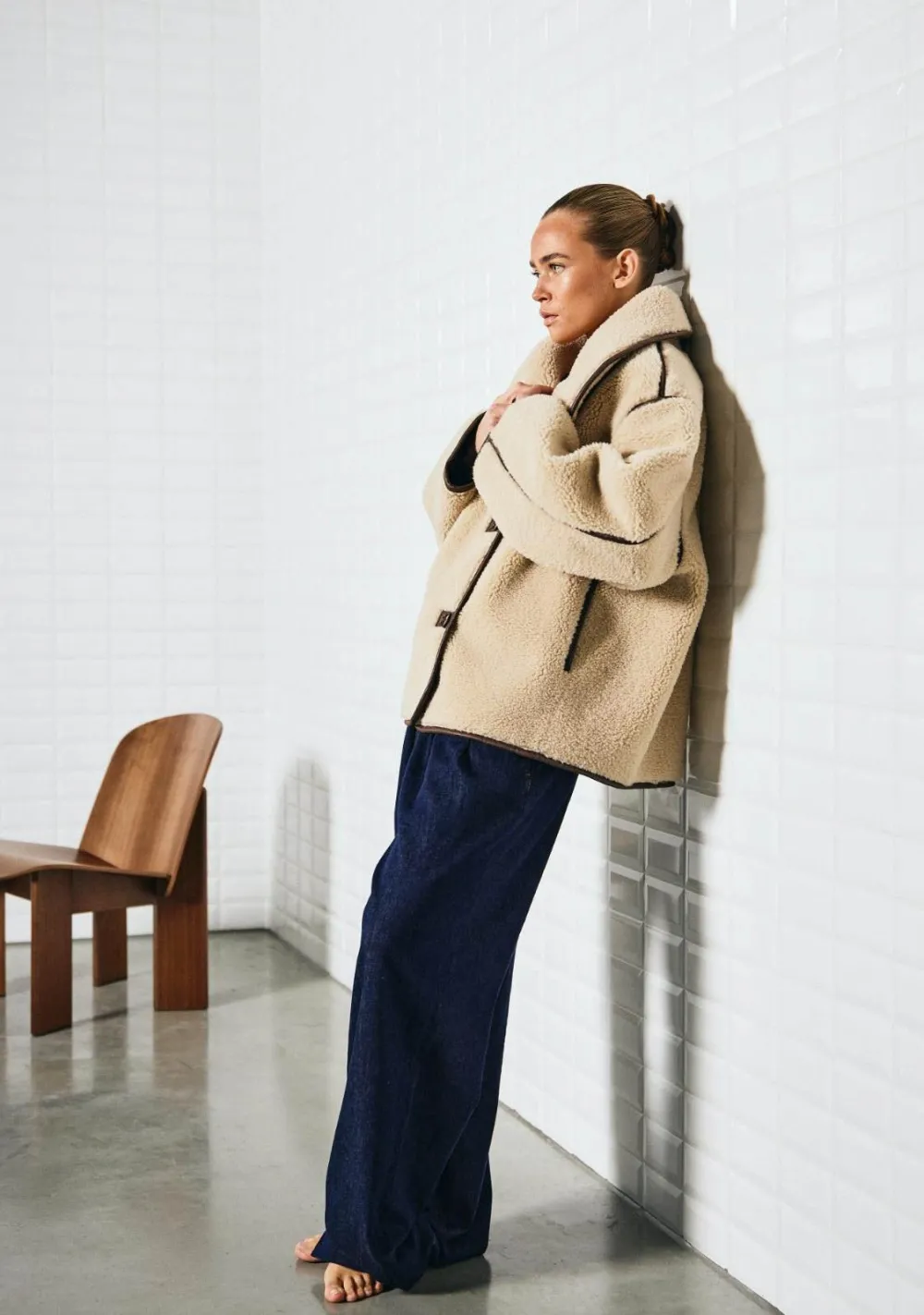 – Het model is 1.72m lang en draagt maat S