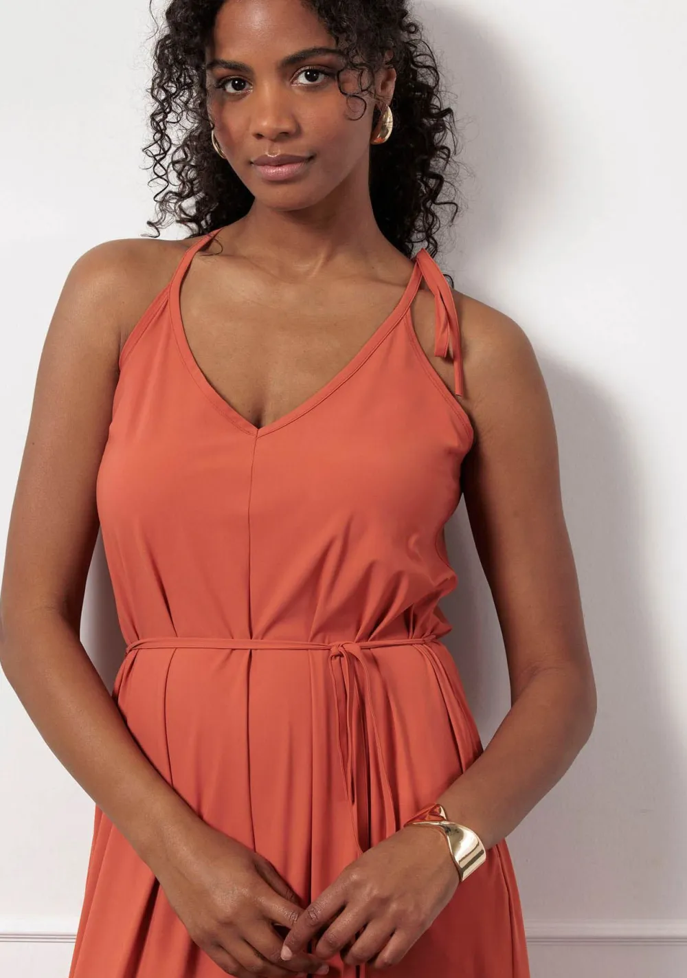 – Het model is 1.76m lang en draagt maat S