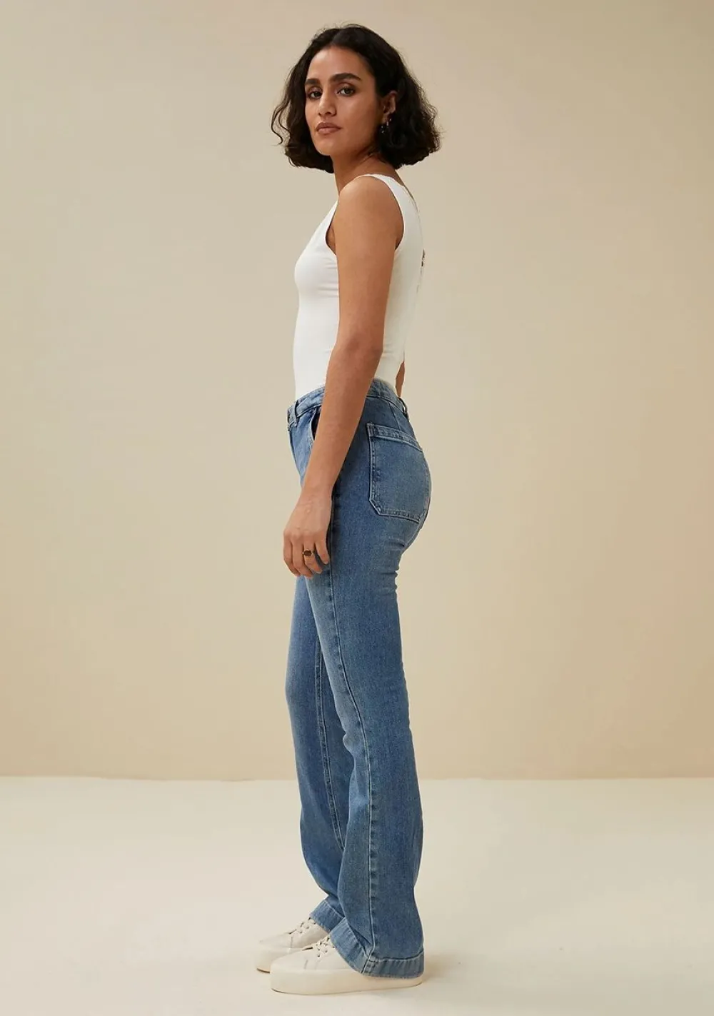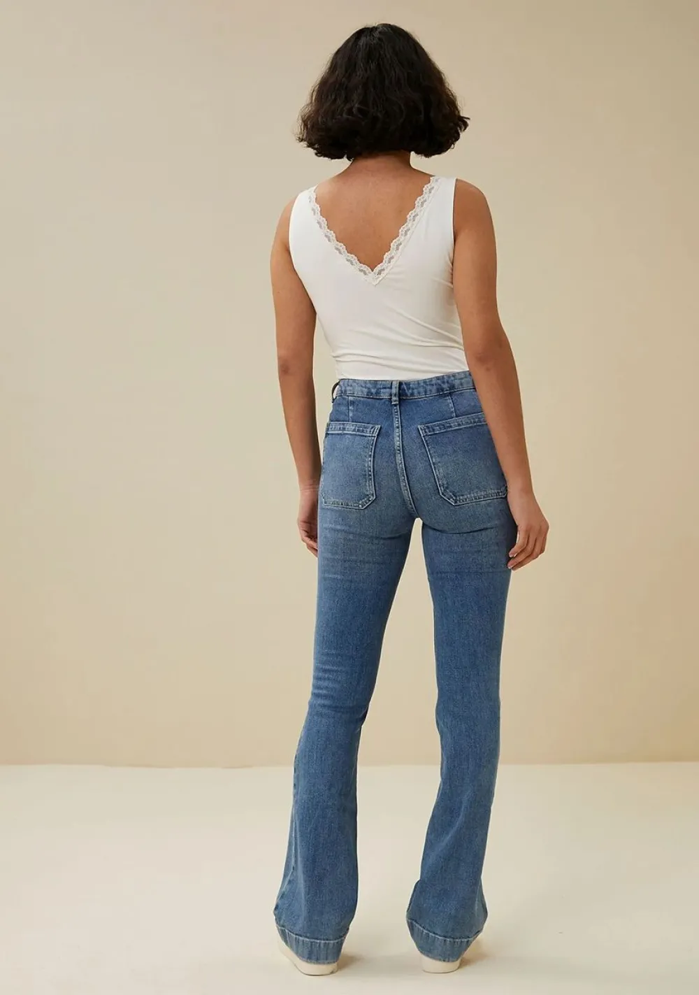 – Het model is 1.76m lang en draagt maat S