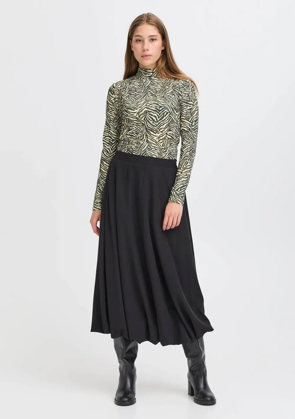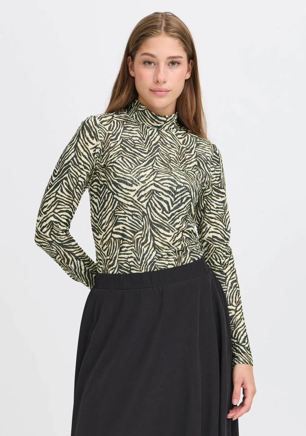 – Het model is 1.76m lang en draagt maat S