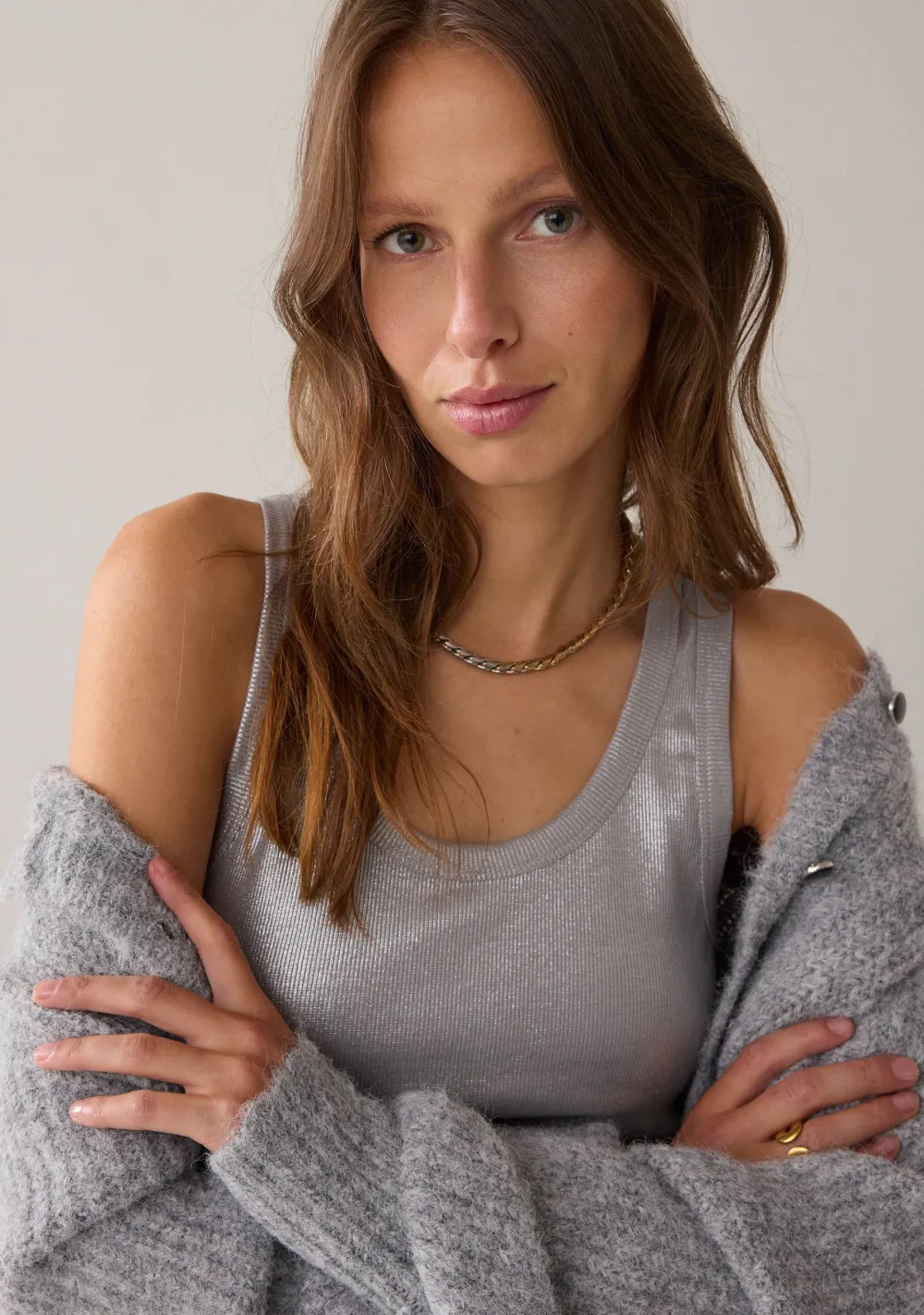 – Het model is 1.76m lang en draagt maat S