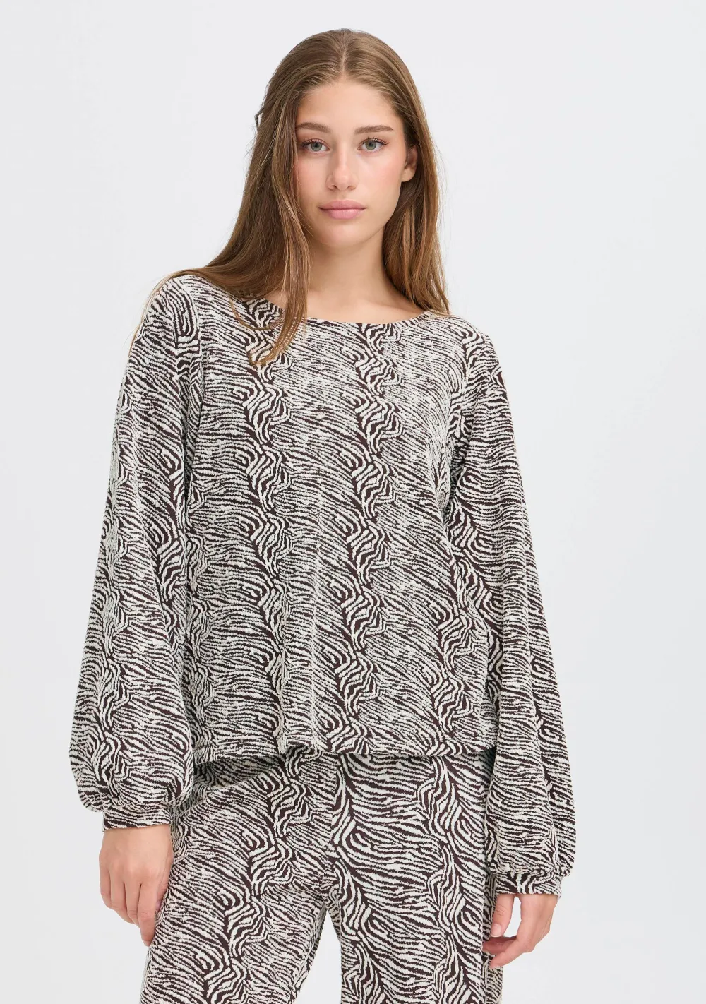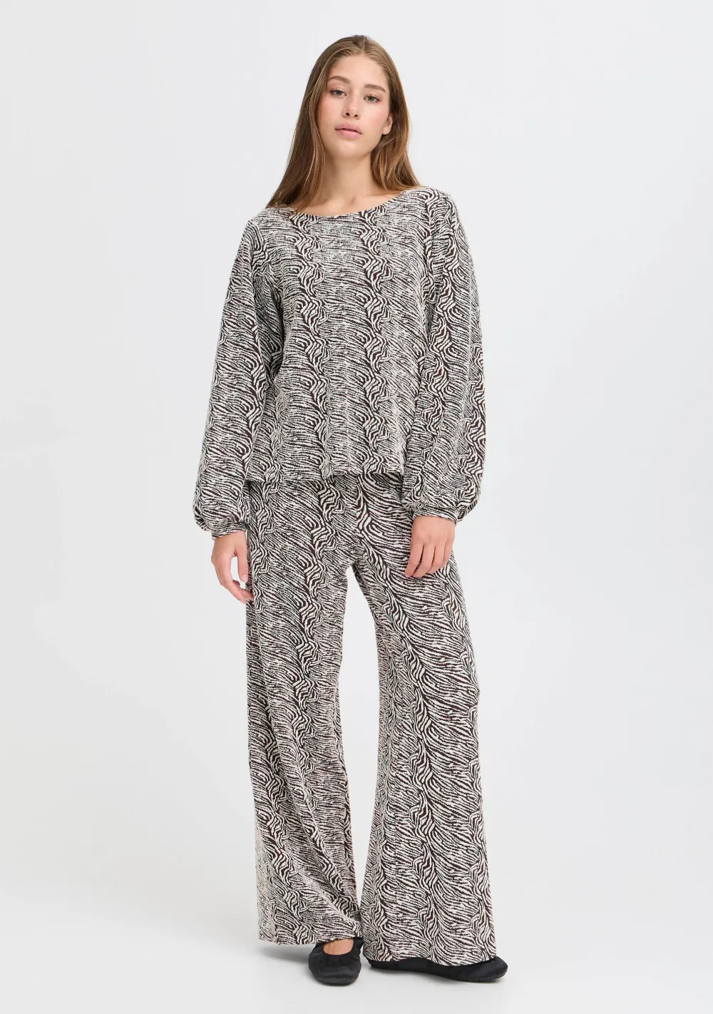 – Het model is 1.76m lang en draagt maat S