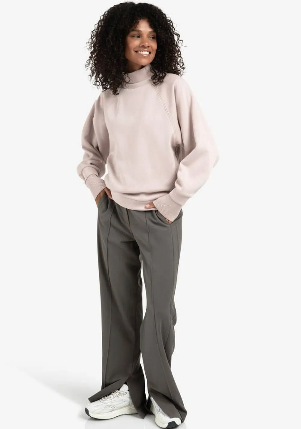 – Het model is 1.76m lang en draagt maat S