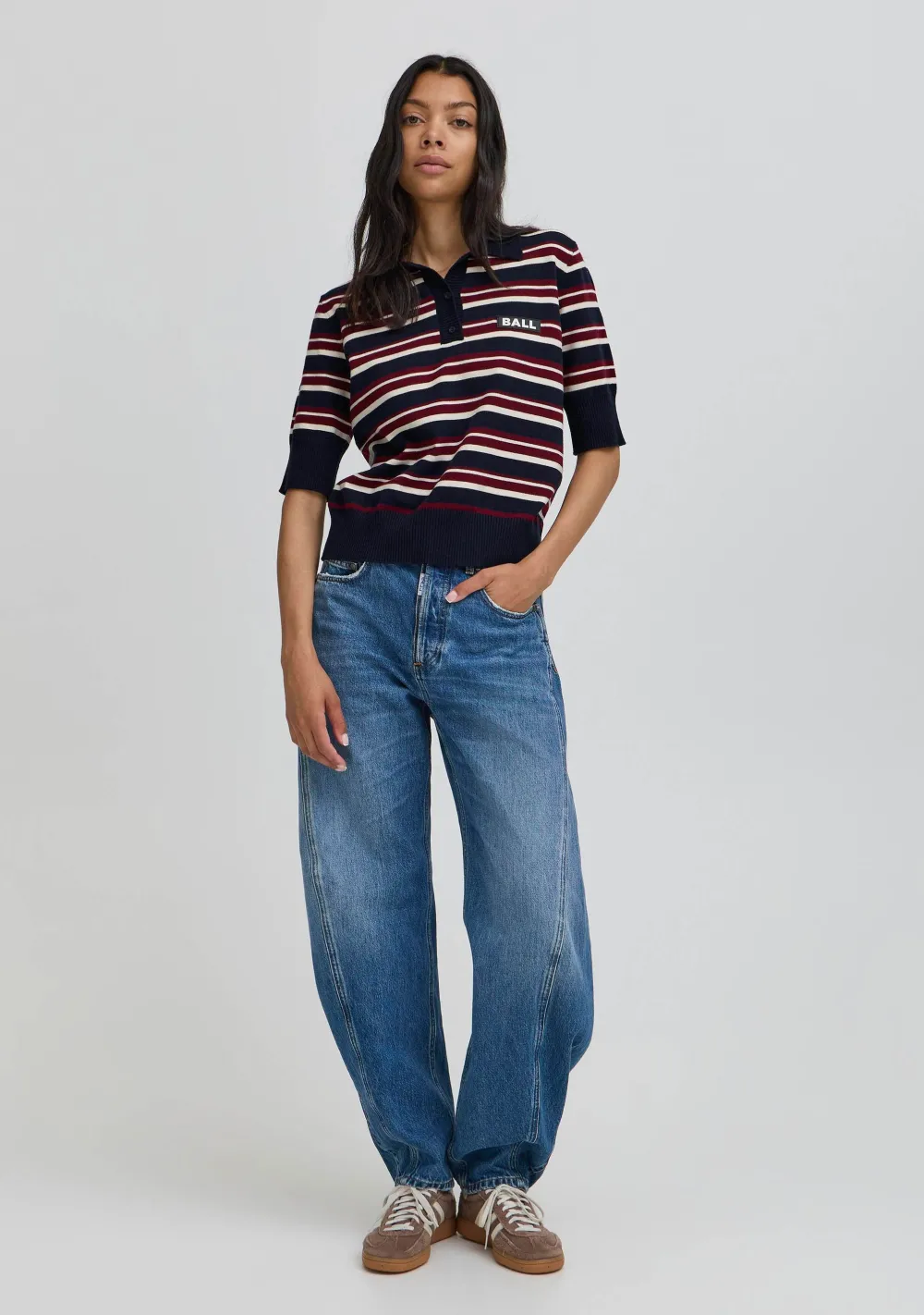 – Het model is 1.76m lang en draagt maat XS